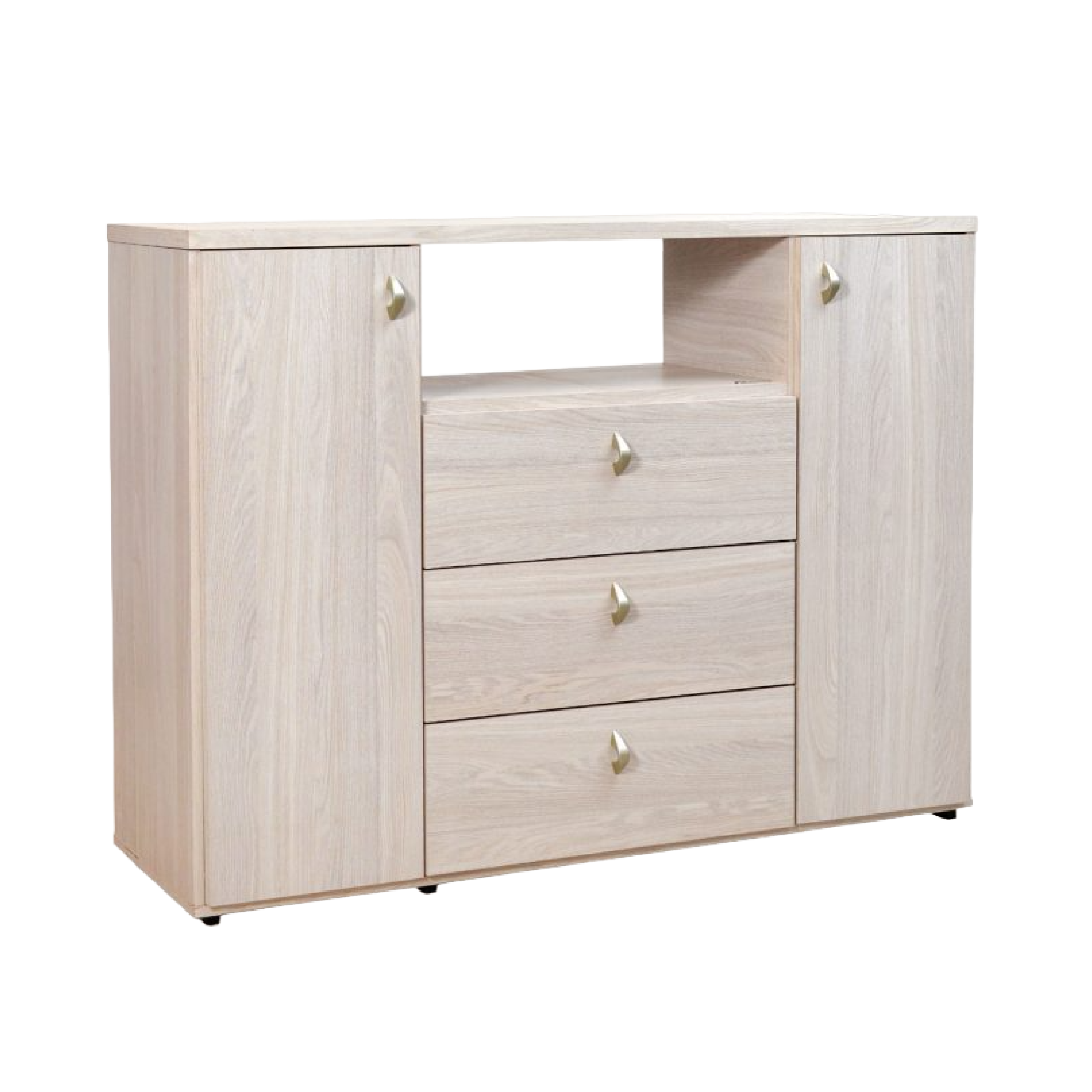 Fabricado en melamina color gris andino / 3 cajones con correderas metálicas / 2 puertas con estantes / Medidas: 1.20 de ancho x 0.36 de profundidad x 0.93 de alto.