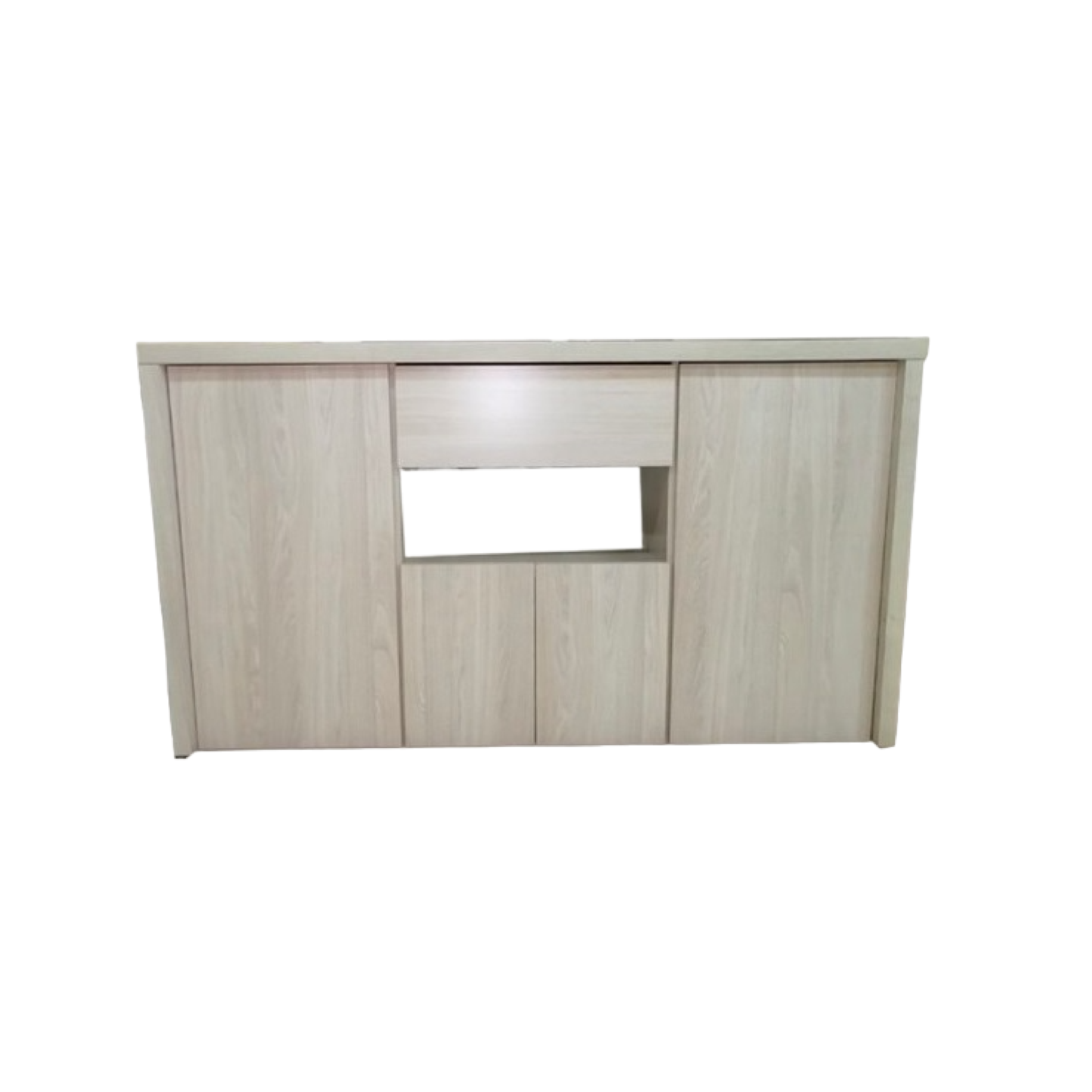 Fabricado en melaminca color gris andino / 2 puertas grandes y 2 chicas / 1 cajón con correderas metálicas / Medidas: 1.60 de ancho x 0.45 de profundidad x 0.92 de alto.