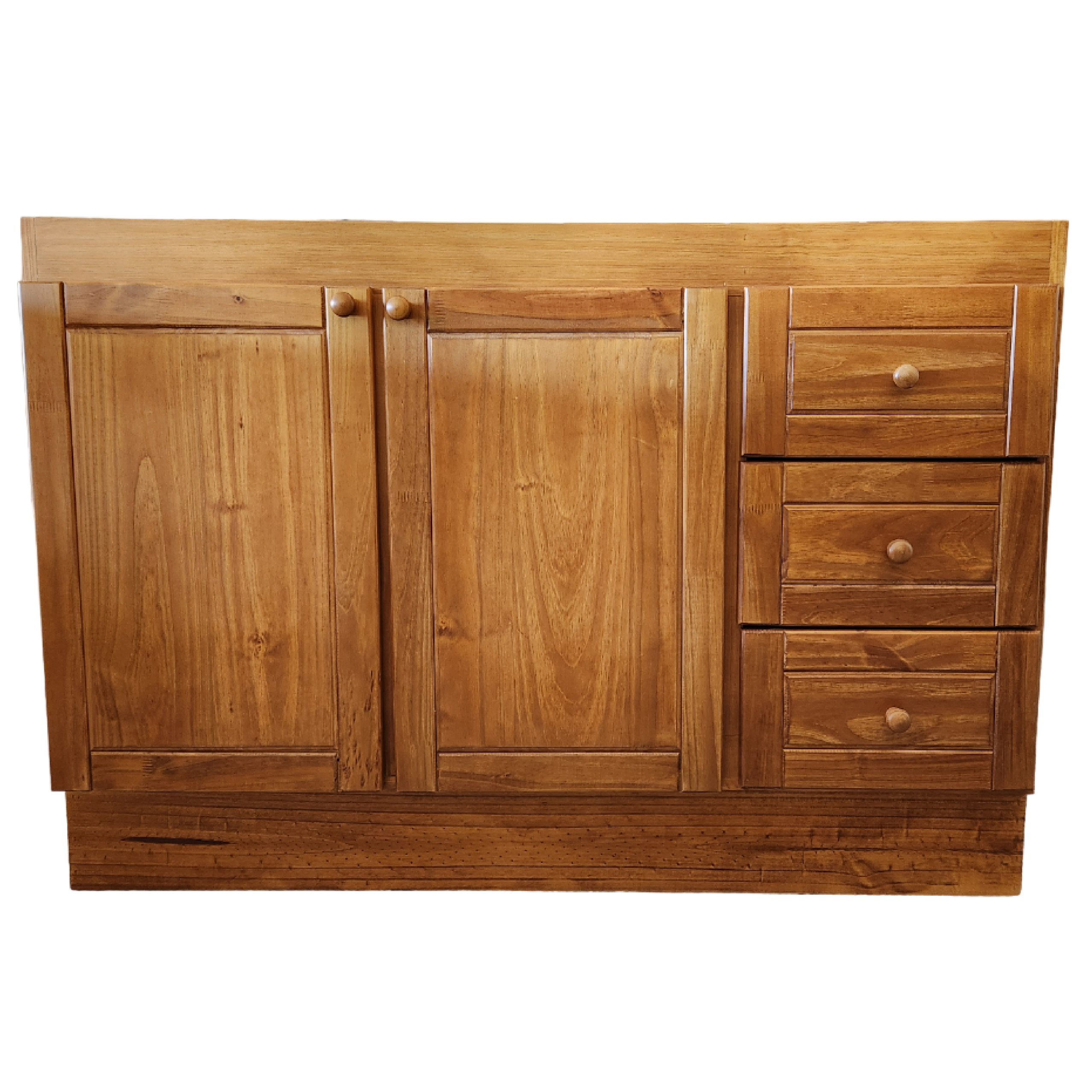 Fabricado en pino misionero / 2 puertas / Cajonera derecha con 3 cajones / Lustre caramelo / Medida: 1.20 mts.