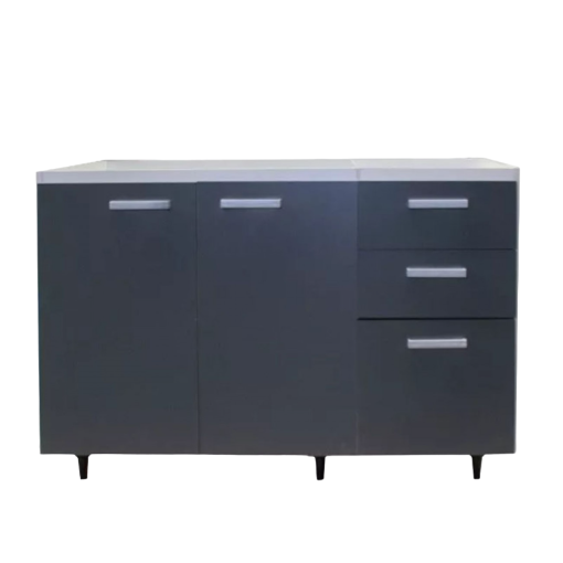 Fabricado en melamina color blanco combinado con gris grafito / 2 puertas / 3 cajones opcional izqquierda/derecha / 1 estante regulable / Correderas metálicas / Medidas: 1.40 de ancho x 0.58 de profundidad x 0.83 de alto.