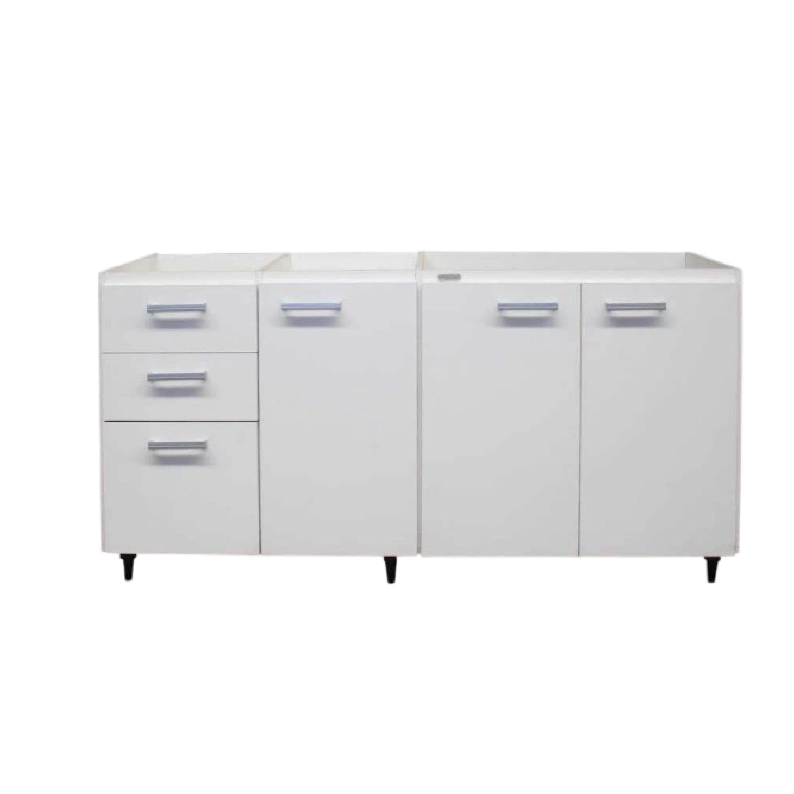 Fabricado en melamina color blanco / 3 puertas / 3 cajones opcional izquierda/derecha / Estante regulable / Correderas metálicas / Medidas: 1.60 de ancho x 0.58 de profundidad x 0.83 de alto.