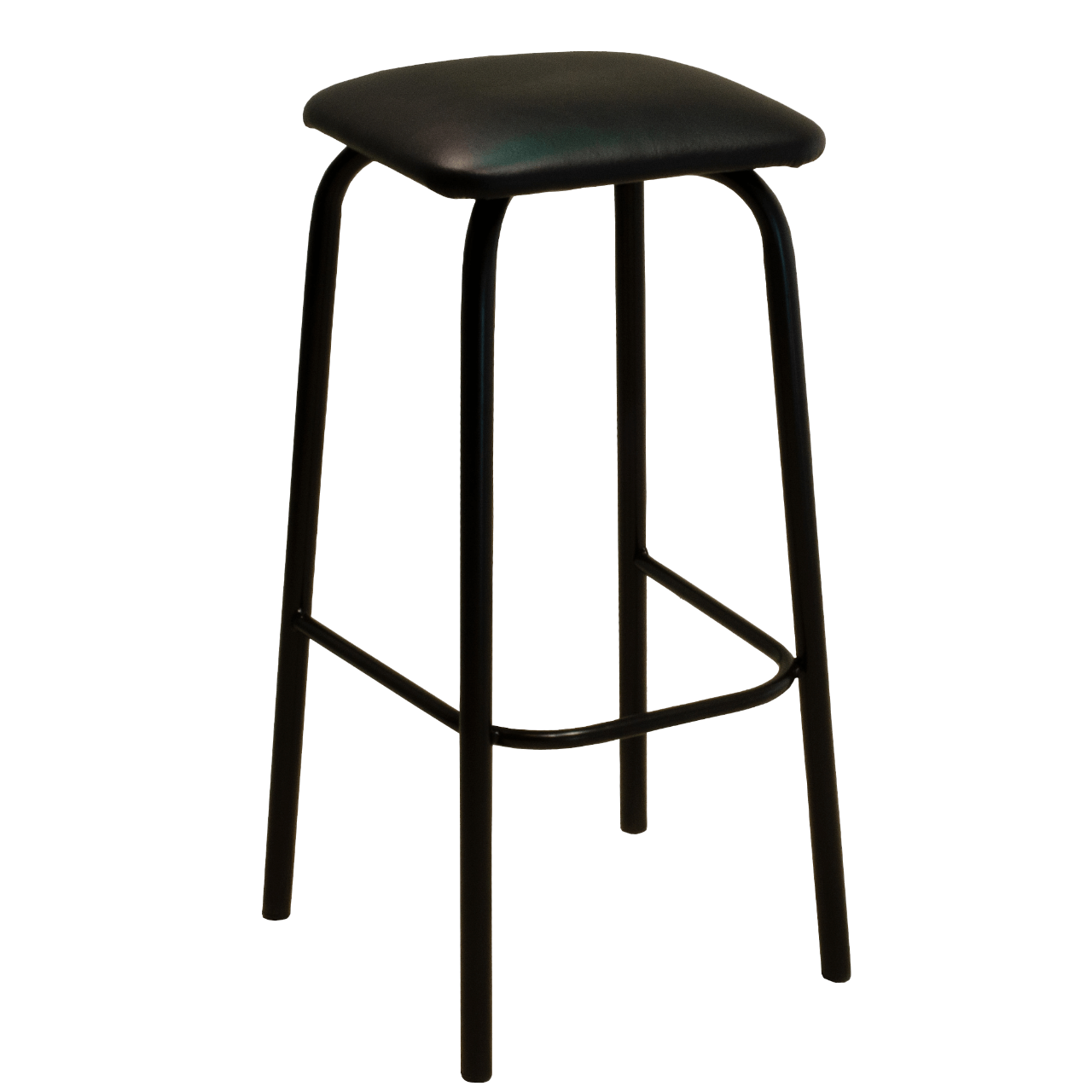 Estructura en caño redondo de 1 pulgada / Asiento tapizado en ecocuero / Sin respaldo / Apoyapiés / Caño negro.