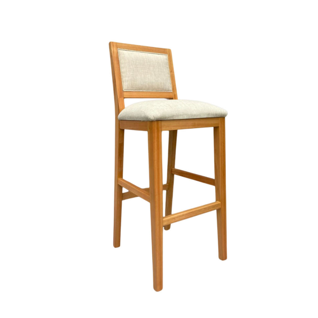 Banqueta alta con respaldo y asiento tapizado en tela grupo 2 / Lustre habano claro.