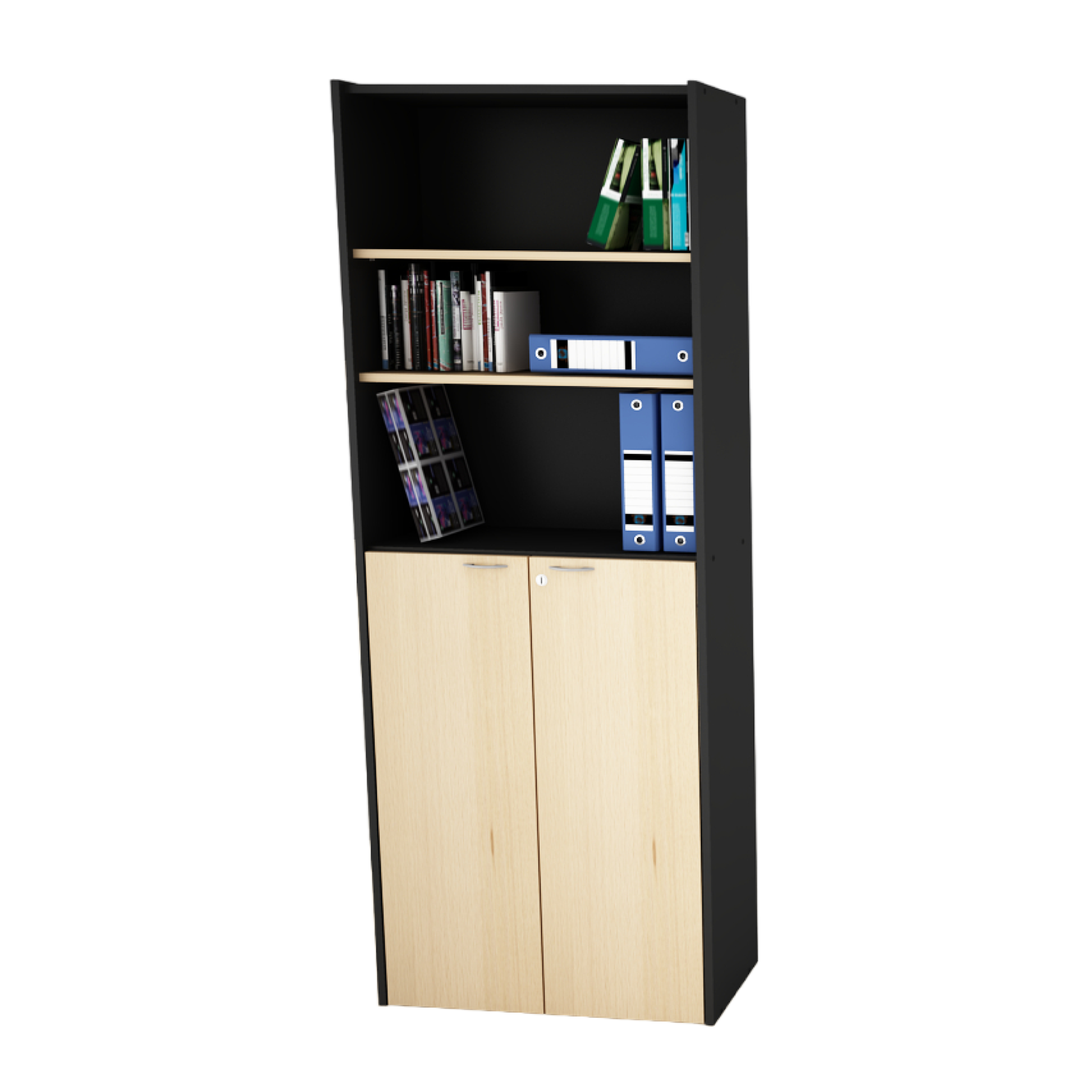 Fabricado en melamina 18mm / Biblioteca alta con media puerta / Estantes móviles y fijos / Con cerradura / Medidas: 2.00 de alto x 0.36 de profundidad x 0.76 de ancho / Color negro combinado con haya.