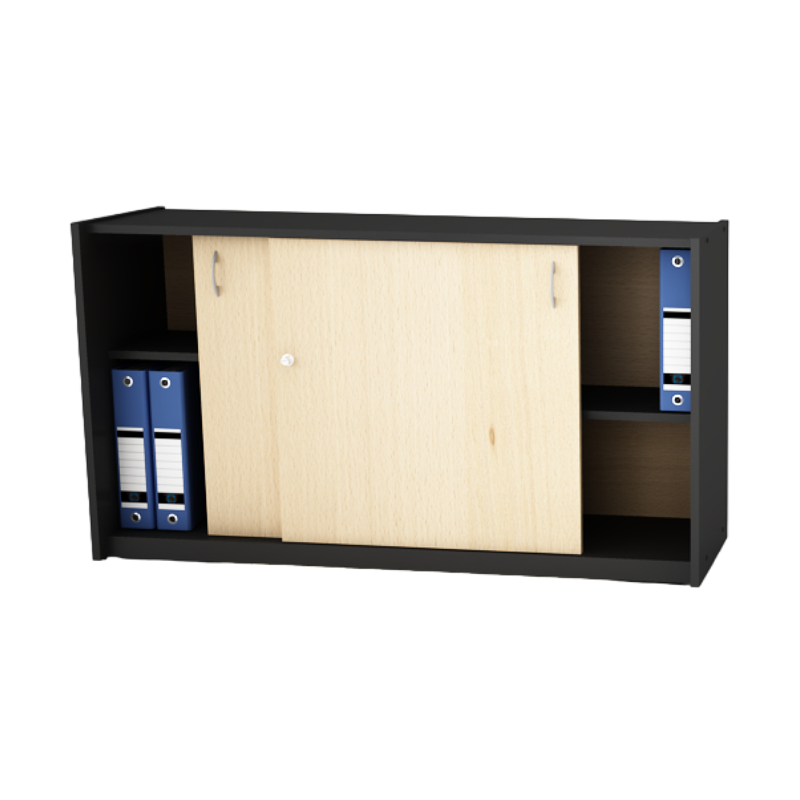 Fabricado en melamina 18mm / Biblioteca baja con puertas corredizas / Estantes móviles / Con cerradura / Medidas: 0.73 de alto x 1.32 de ancho x 0.40 profundidad / Color negro haya.