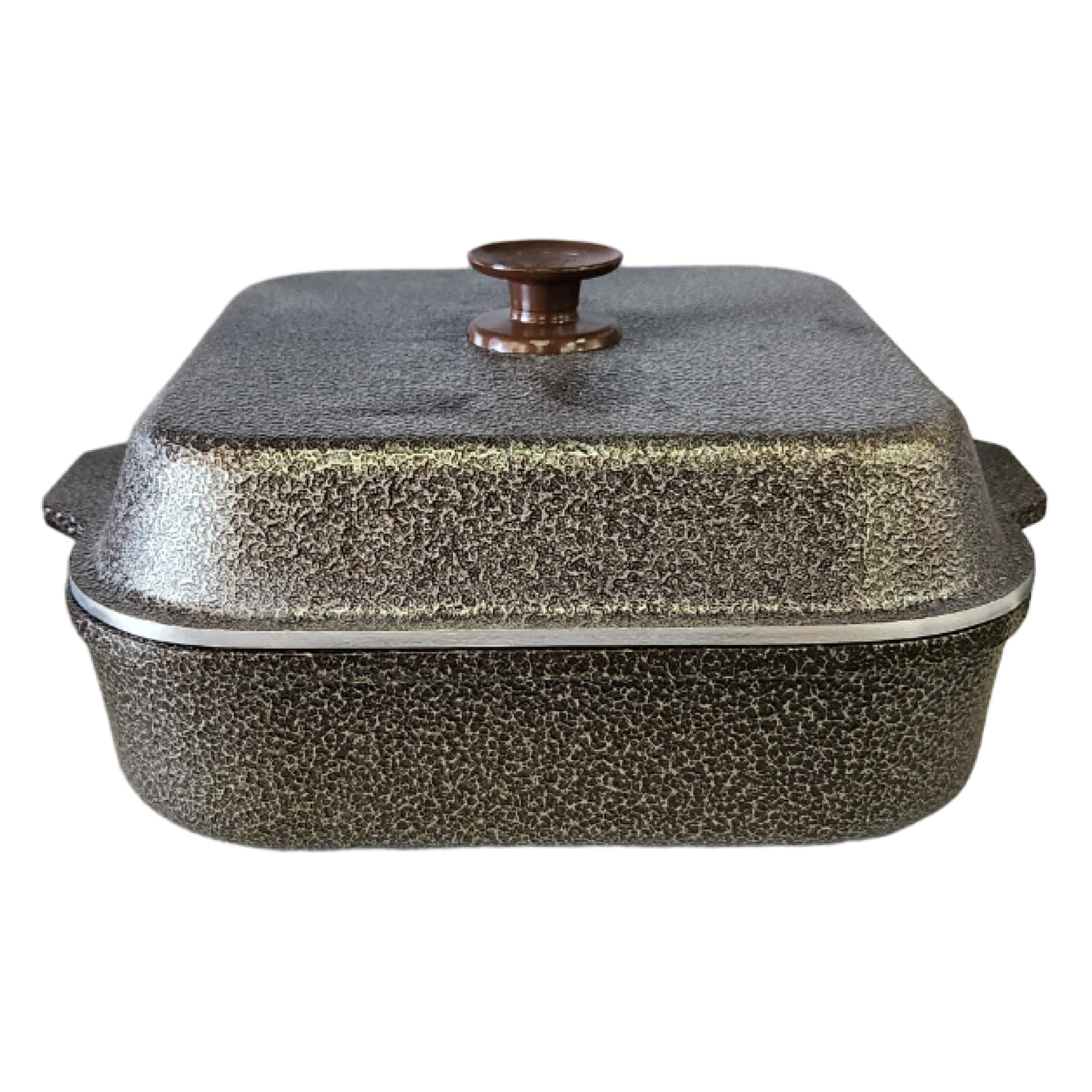 Cacerola de material de aluminio con antiadherente / Cuadrada con asas y tapa / Revestida exteriormente por esmalte Epoxi poliester / Facil limpieza, inalterable al fuego / Capacidad: 5 Lts. / Medida: 28,5 de diametro y 7,5 cm. de alto.