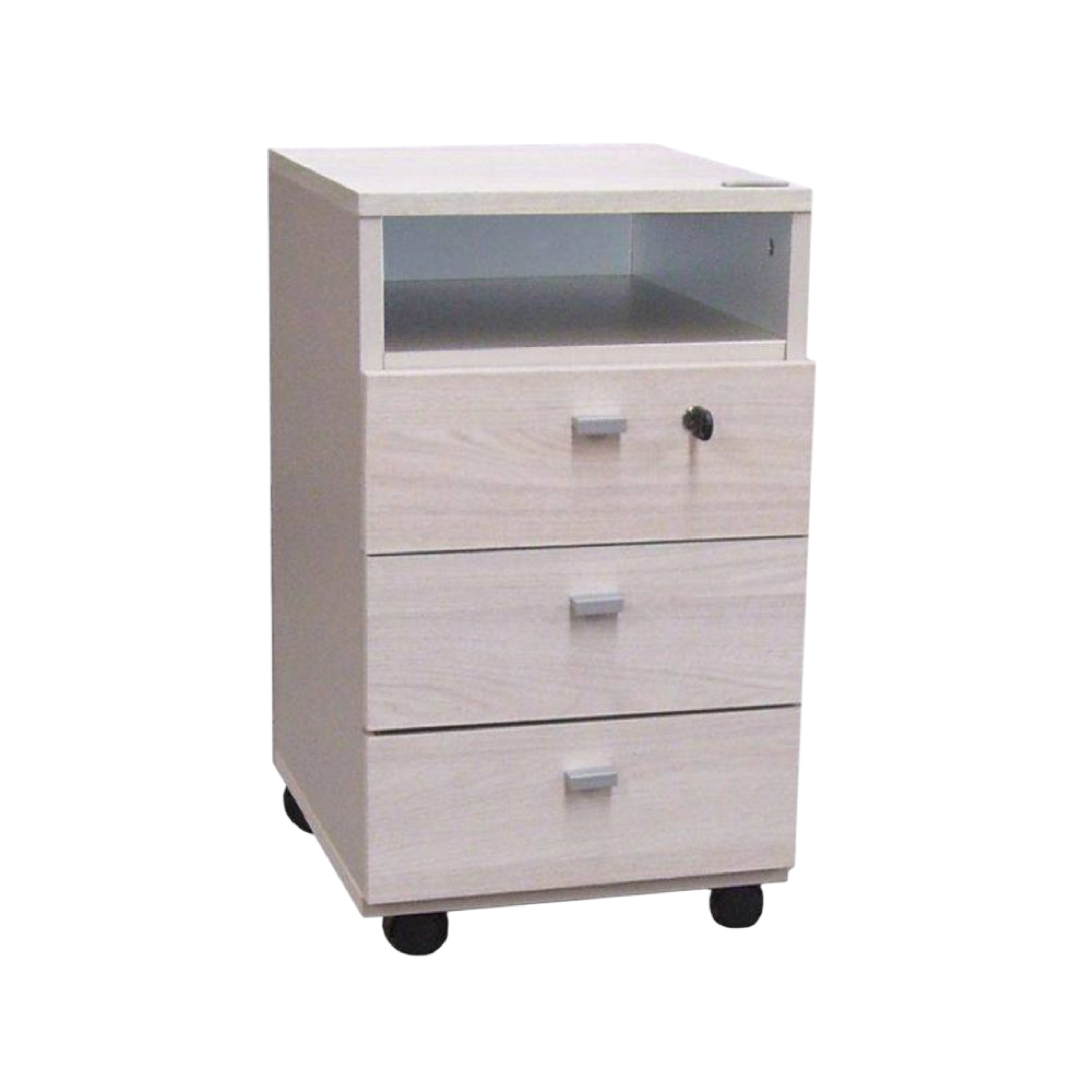 Fabricada en melamina color gris andino / 3 cajones (superior con cerradura) / 1 Estante / Correderas metálicas / Medidas: 0.64 de alto x 0.43 de profundidad x 0.37 de ancho.