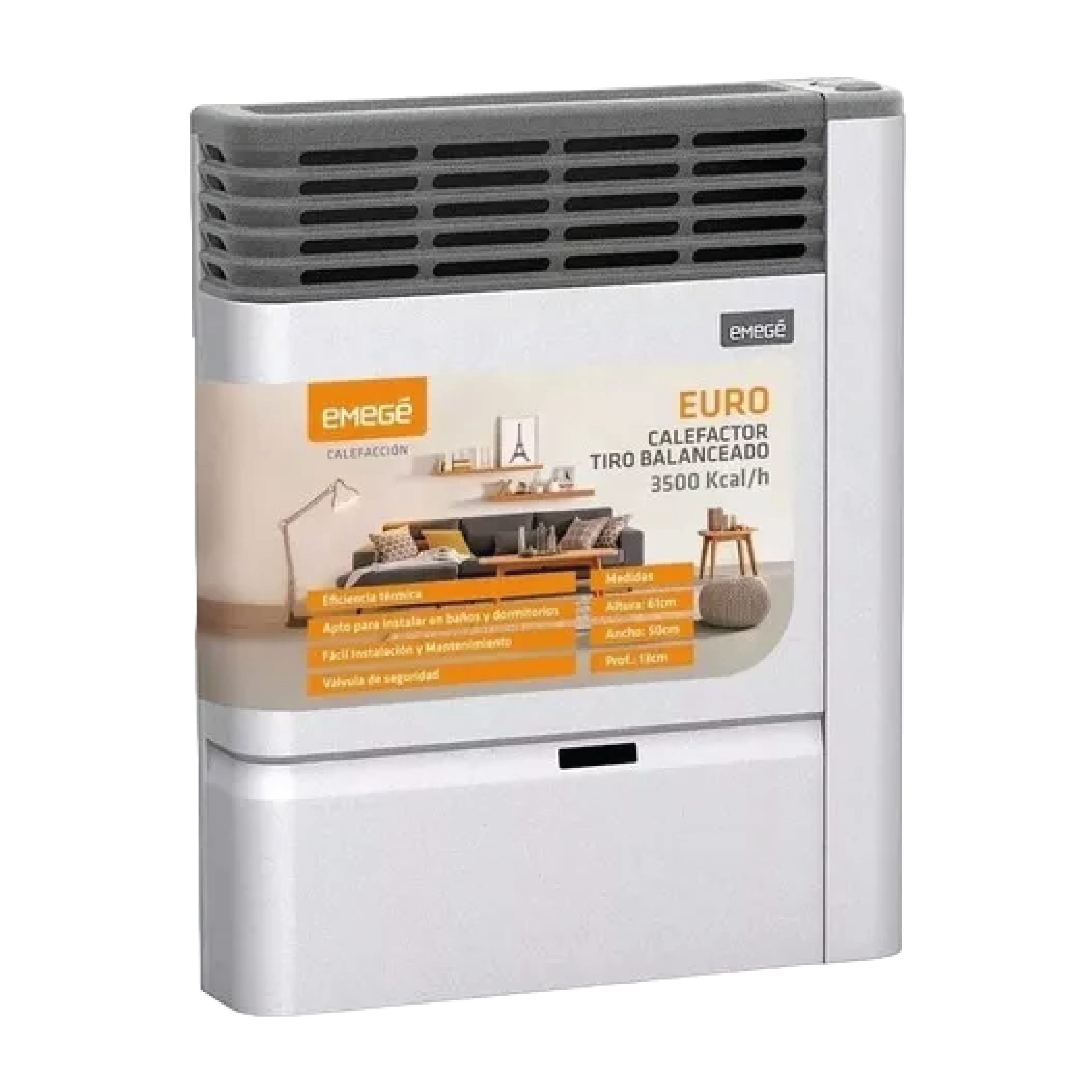 Multigas / Tiro balanceado / 3500 Kcal/h / Cámara enlozada con deflector laminar / Encendido / Válvula de seguridad / Ventilación horizontal.