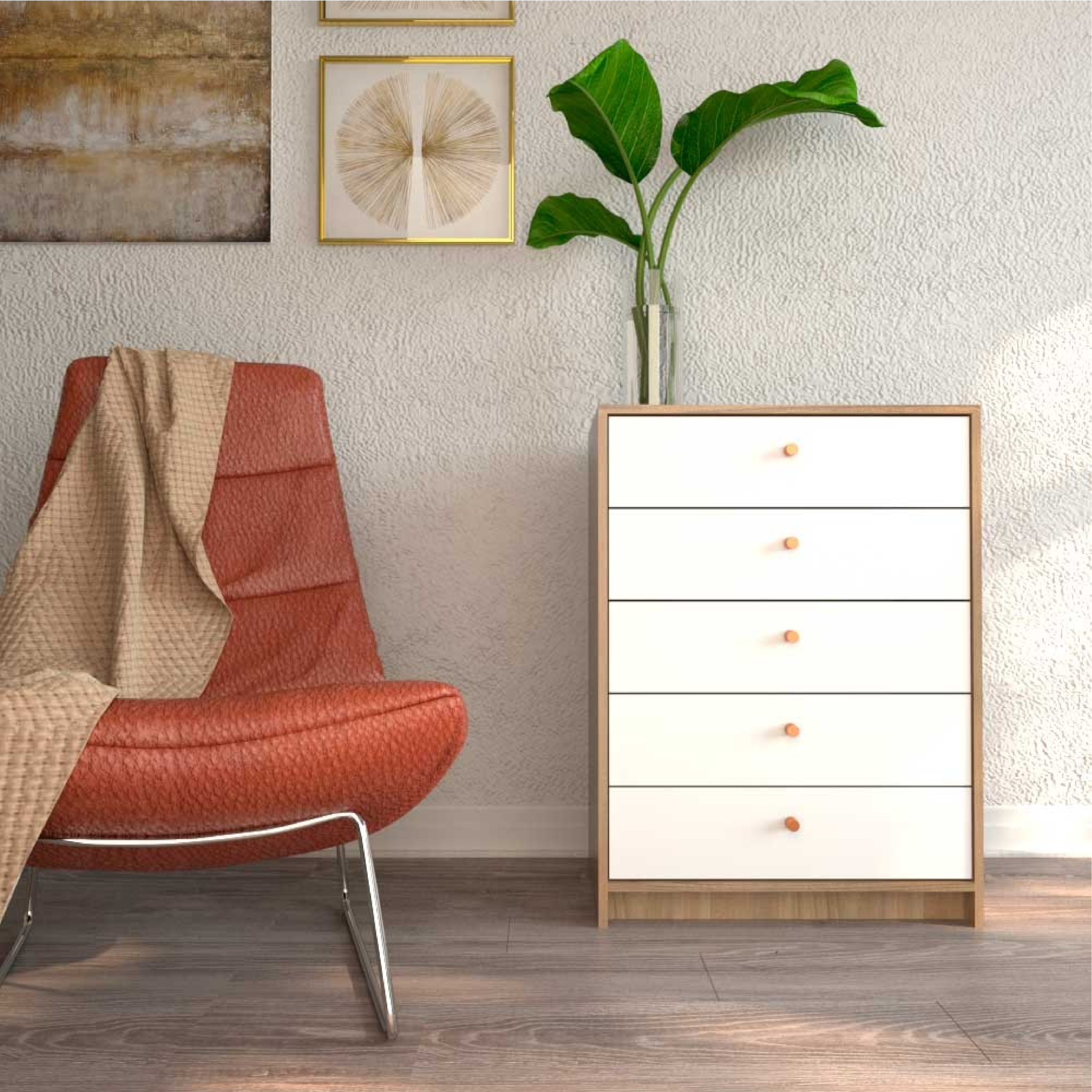 Fabricado en melamina color olmo finlandes combinado con everest / 5 cajones / Correderas metálicas / Tiradores metálicos color cobre envejecido / Medidas: 0.67 de largo x 0.78 de alto x 0.45 de ancho.