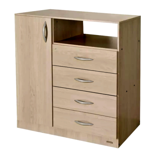Fabricado en melamina color savanna / 4 cajones con correderas metálicas / 1 puerta con estantes móviles / Medidas: 1.00 de ancho x 0.47 de profundidad x 1.02 de alto.