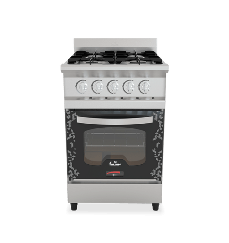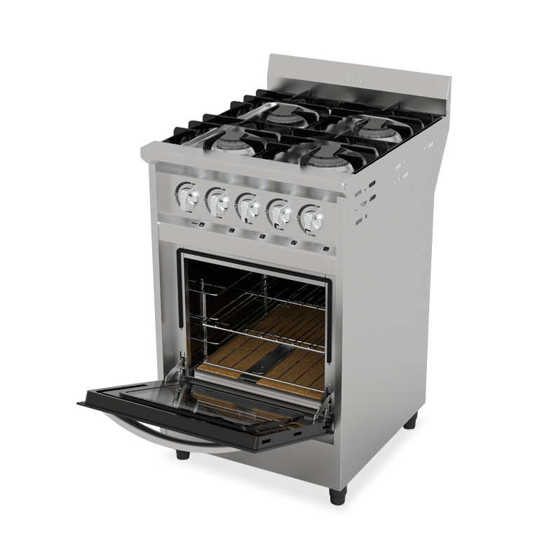 Gabinete semi-industrial de acero inoxidable / 4 quemadores redondondos / Posaolla de fundición liviana / Horno con puerta de vidrio y piso refractario / Cámara de cocción abovedada / Válvula de seguridad multigas, reguladas de fábrica para GN / Medidas: 0.90 de alto x 0.60 de profundiad x 0.60 de ancho.