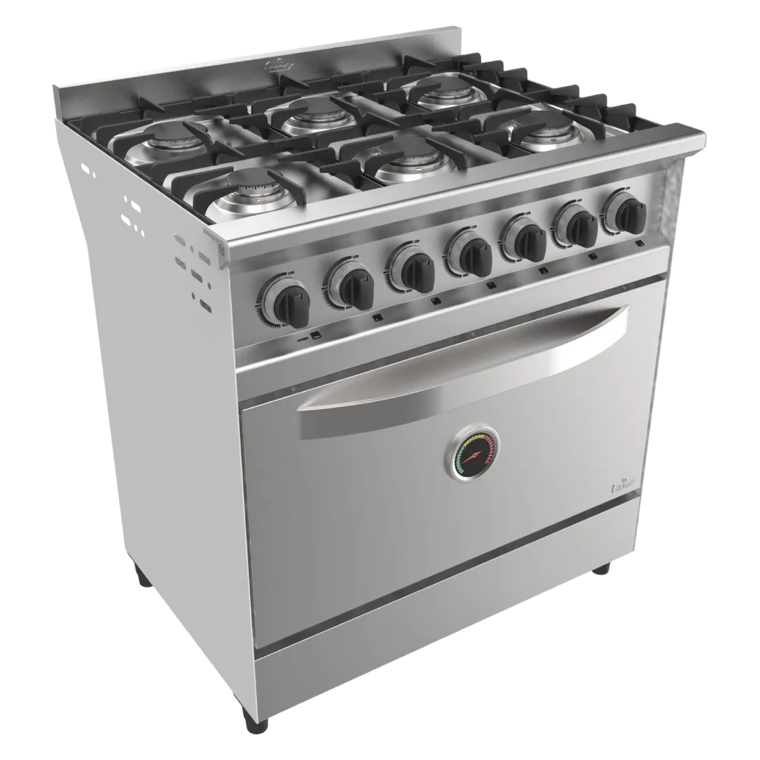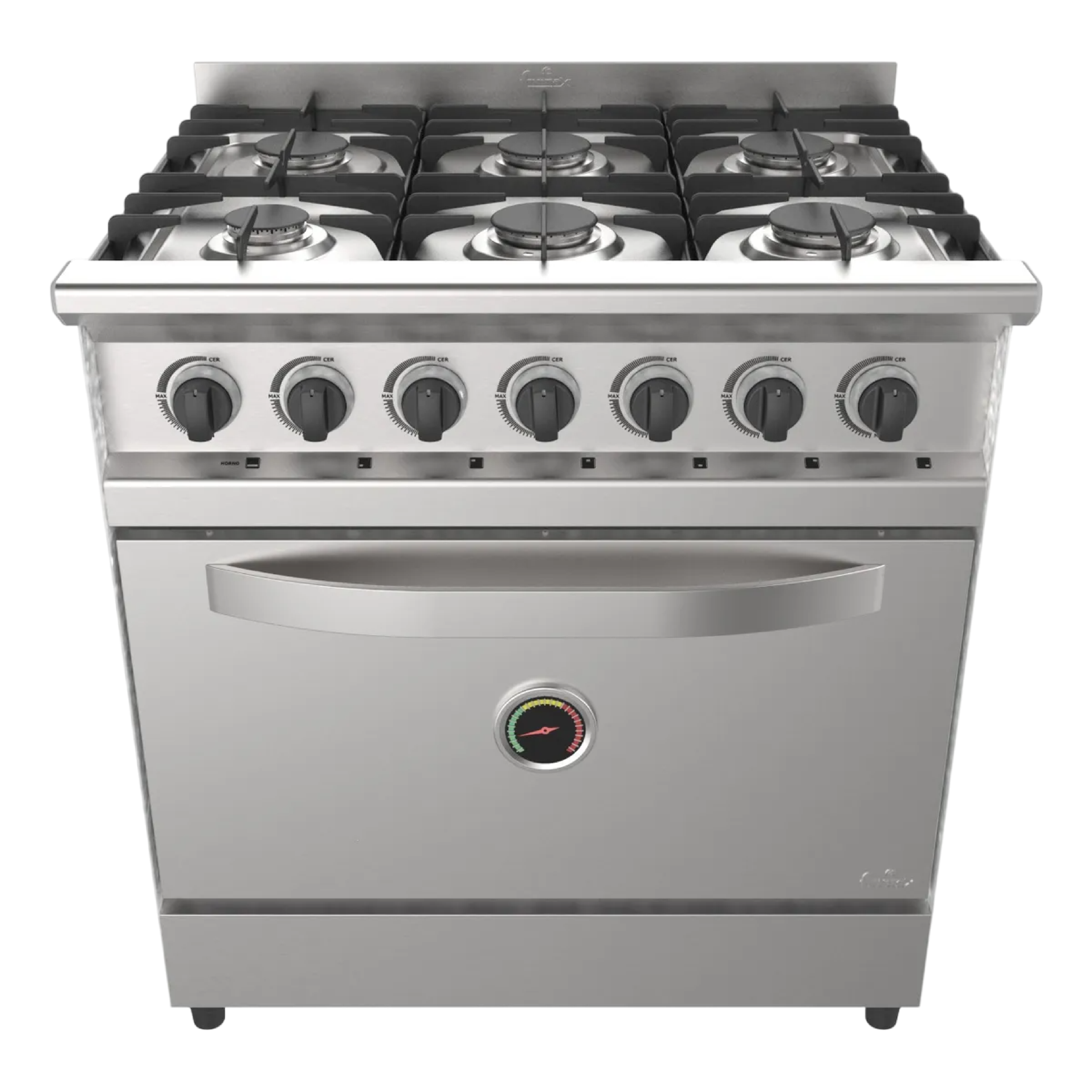Gabinete con frente de acero inoxidable / 6 quemadores con tapa enlozada de eficiencia A / Posaolla de fundición de hierro / Puerta ciega de acero / Cámara de cocción abovedada con enlozado Easy Clean y piso refractario / Válvula de seguridad multigas, reguladas de fábrica para GN / Medidas: 0.87 de alto x 0.60 de profundiad x 0.82 de ancho.
