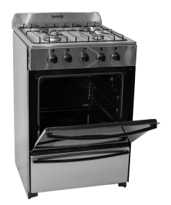 Gas natural / 4 hornallas (3 medianas y una grande) / Quemadores de aluminio pulido con tapa de acero esmaltada / Horno enlozado de fácil limpieza / Puerta de vidrio / Válvula de seguridad en horno y hornallas / Medidas: 93cm (Al) x 56cm (An) x 60cm (Pr) / Acero inoxidable con laterales negros.