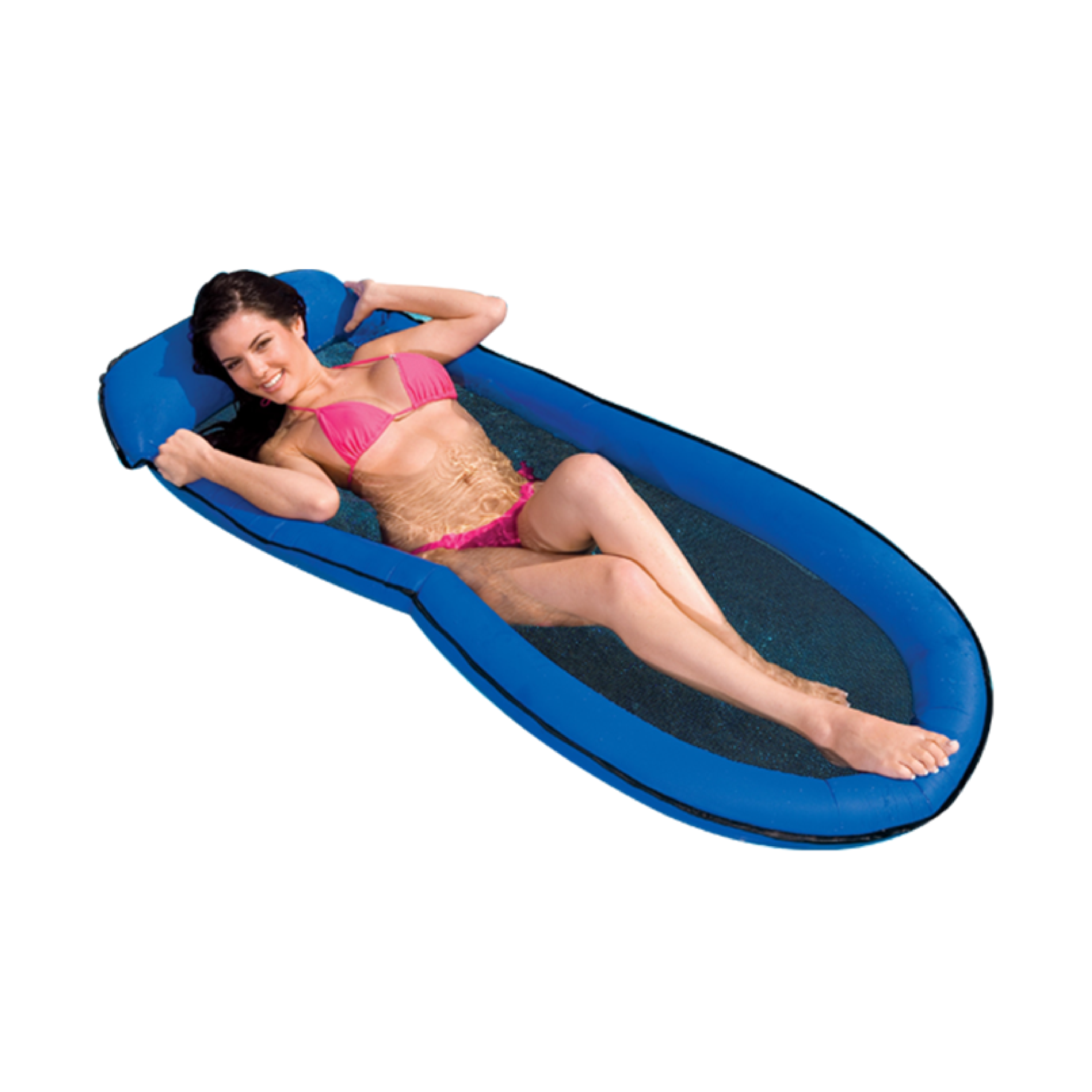 Colchoneta para el agua / Modelo con apoya cabeza y bordes inflables / Cuerpo de red / Color negra con azul / Medidas: 178x99cm.