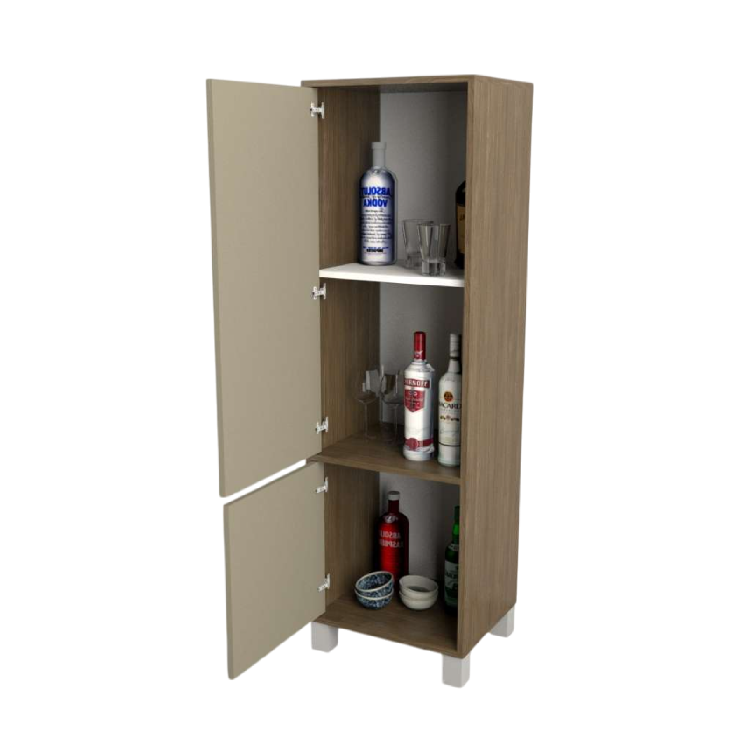 Fabricada en melamina color nogal combinado con gris cubanita / 2 puertas / 3 estantes / Sistema push en puertas / Bisagras metálicas / Patas plásticas con terminación en laca UV / Medidas: 0.45 de largo x 1.40 de alto x 0.36 de profundidad.