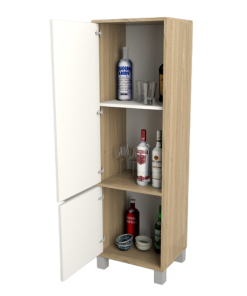 Fabricada en melamina color olmo finlandes combinado con everest / 2 puertas / 3 estantes / Sistema push en puertas / Bisagras metálicas / Patas plásticas con terminación en laca UV / Medidas: 0.45 de largo x 1.40 de alto x 0.36 de profundidad.