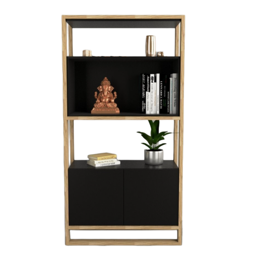 Fabricada en melamina color olmo finlandes combinado con negro / 2 puertas bajas / 3 estantes vistos / Sistema push en puerta / Bisagras metálicas / Medidas: 0.90 de largo x 1.73 de alto x 0.38 de profundidad.