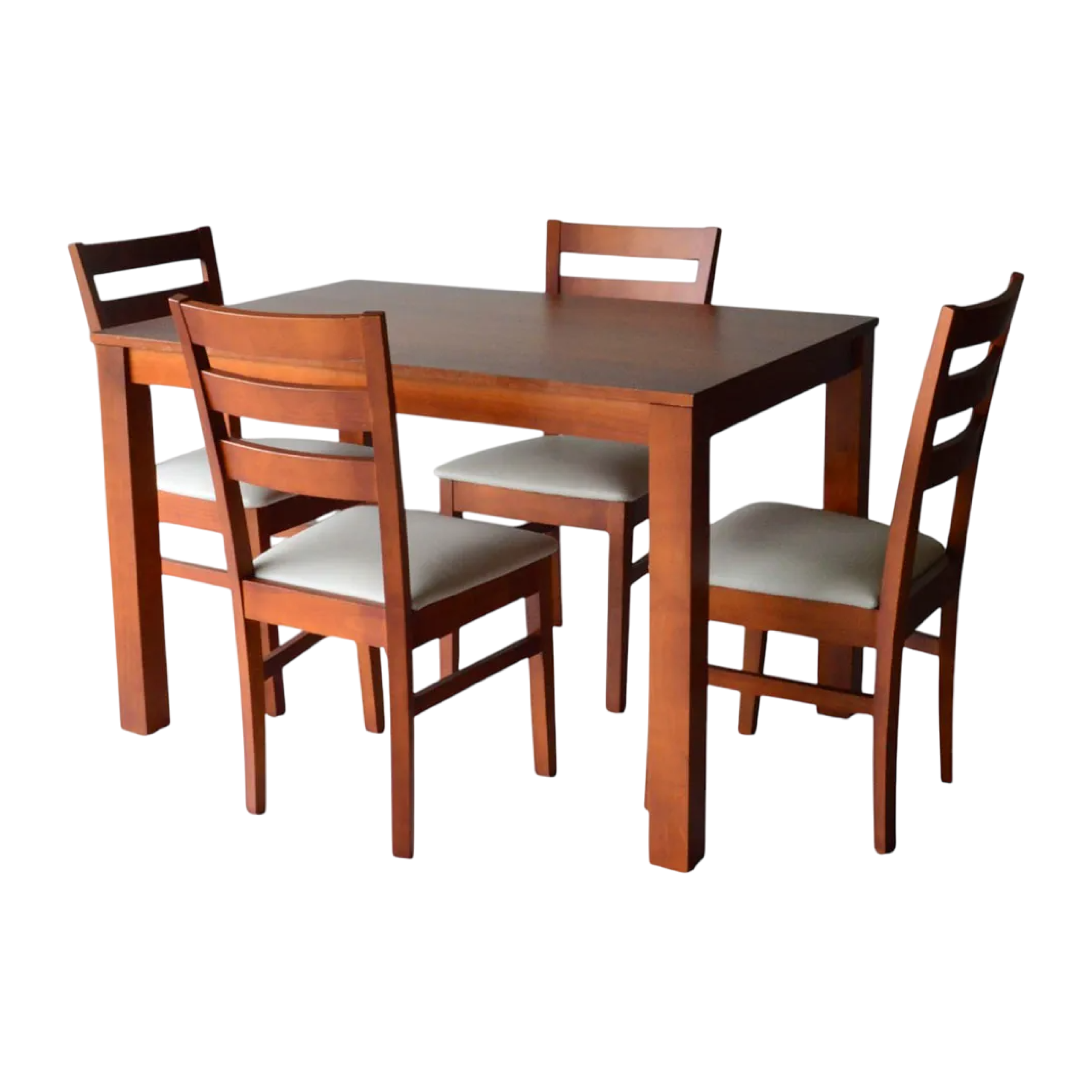 Fabricado en madera maciza / Incluye mesa Alpha de 1.20×0.80 con patas 3×3 pulgadas y tapa enchapada en guatambú + 4 sillas modelo Alpha con asiento tapizado en eco cuero y respaldo tablitas horizontales / Lustre cedro.