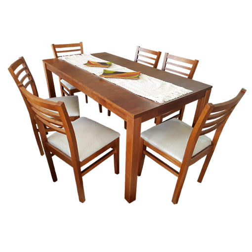 Fabricado en pino / Mesa con veta cruzada de 1.60×0.85 con patas 3 pulgadas + 6 sillas modelo S126 con asiento tapizado en eco cuero / Lustre cedro.