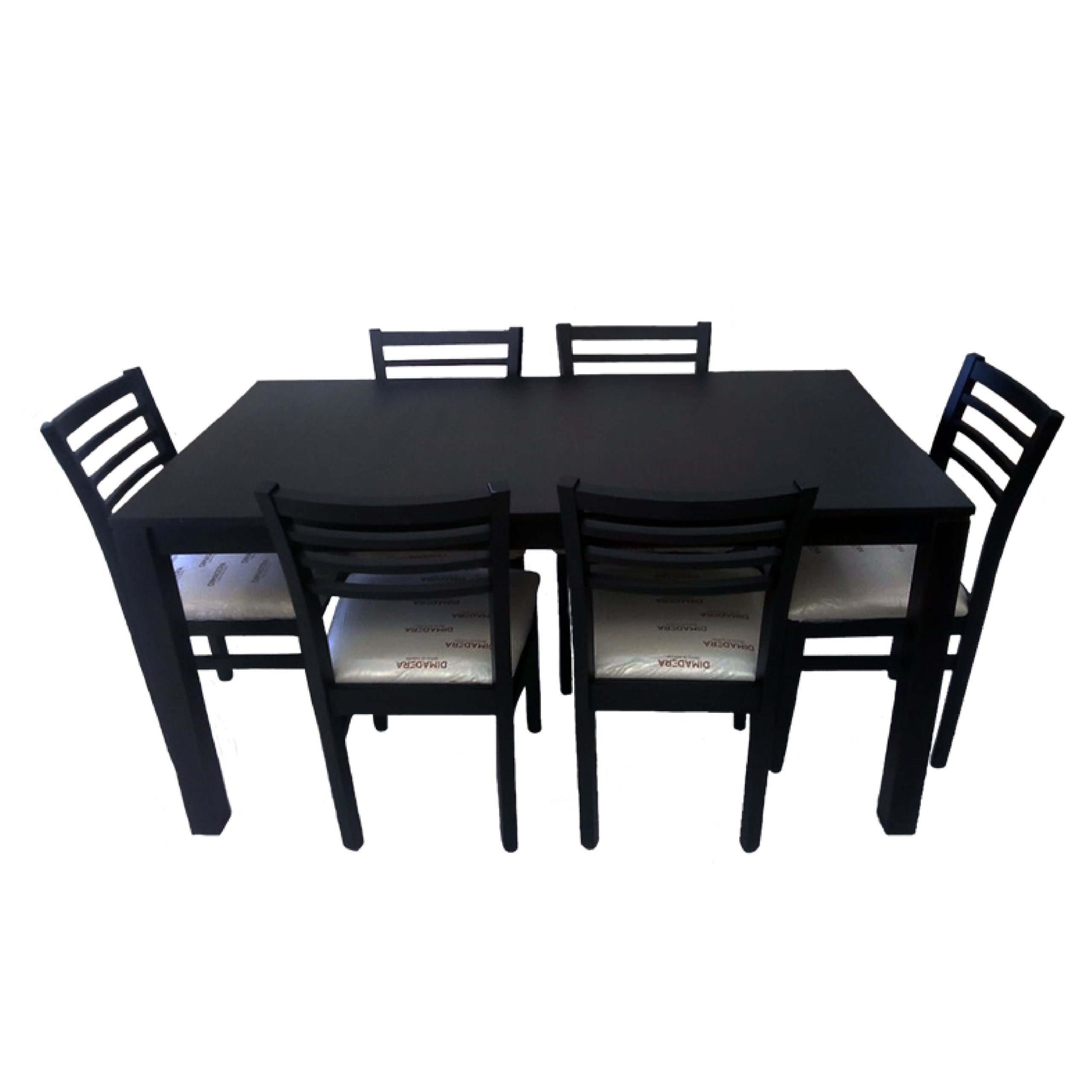 Fabricado en pino / Mesa con veta cruzada de 1.60×0.85 con patas 3 pulgadas + 6 sillas modelo S126 con asiento tapizado en eco cuero / Lustre wengue.