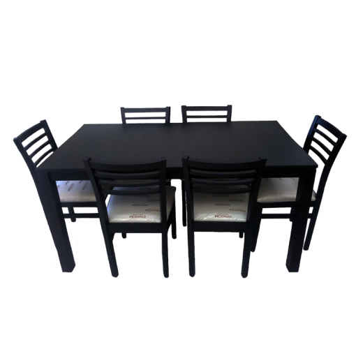 Fabricado en pino / Mesa con veta cruzada de 1.60×0.85 con patas 3 pulgadas + 6 sillas modelo S126 con asiento tapizado en eco cuero / Lustre wengue.
