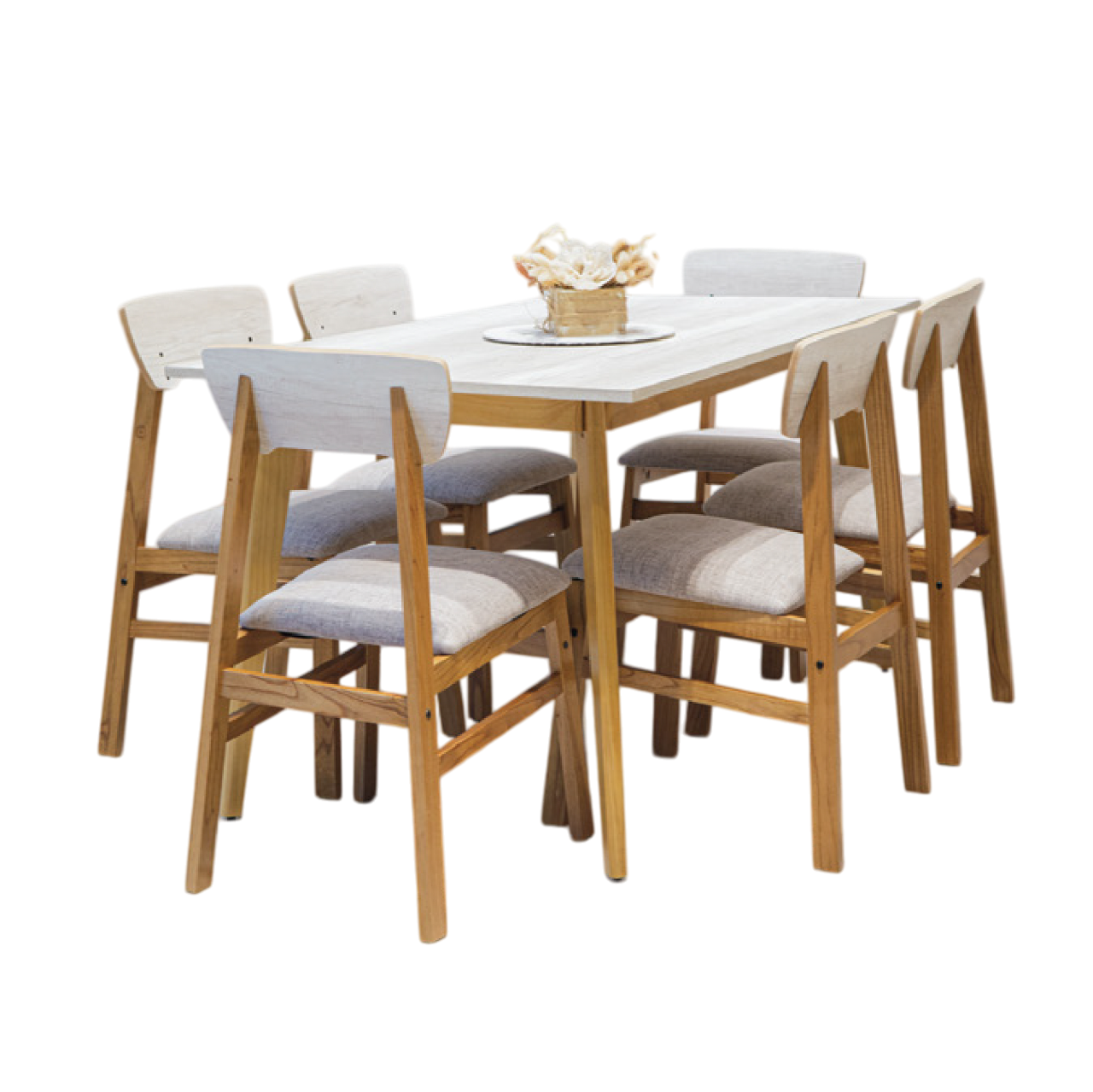 Incluye mesa Nórdica de 1.50×0.87 con base y patas macizas y tapa de melamina de 18mm + 6 sillas modelo Emi con asiento tapizado en ecocuero / Lustre miel combinado con helsinki.