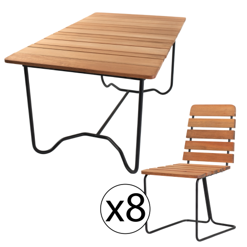 Fabricado en madera Grandis certificada FSC con terminación en impregnante color nogal y caño color negro mate / Formado por 1 mesa fija de 1.95×1.00×0.78 y 8 sillas fijas sin brazos.