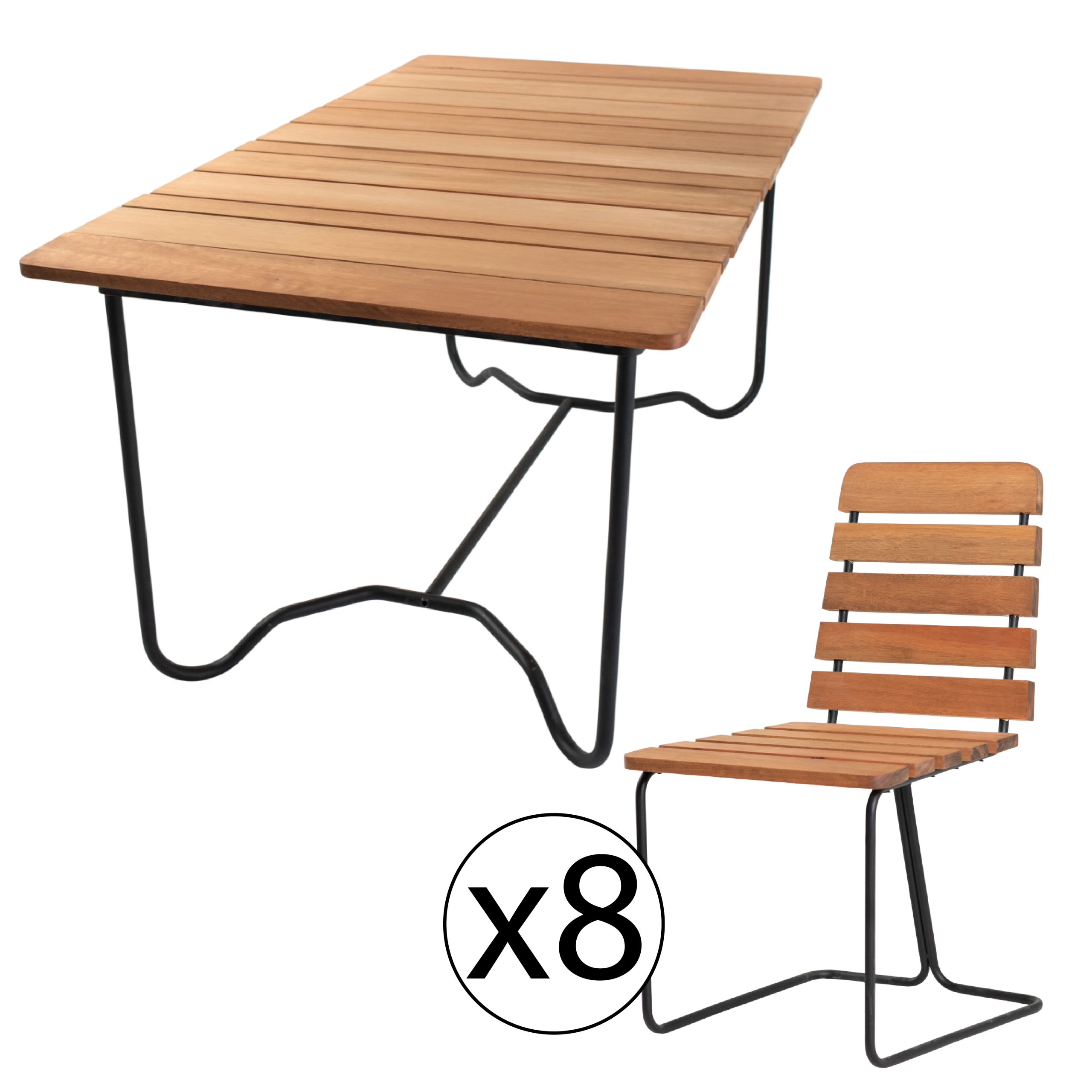 Fabricado en madera Grandis certificada FSC con terminación en impregnante color nogal y caño color negro mate / Formado por 1 mesa fija de 1.95×1.00×0.78 y 8 sillas fijas sin brazos.