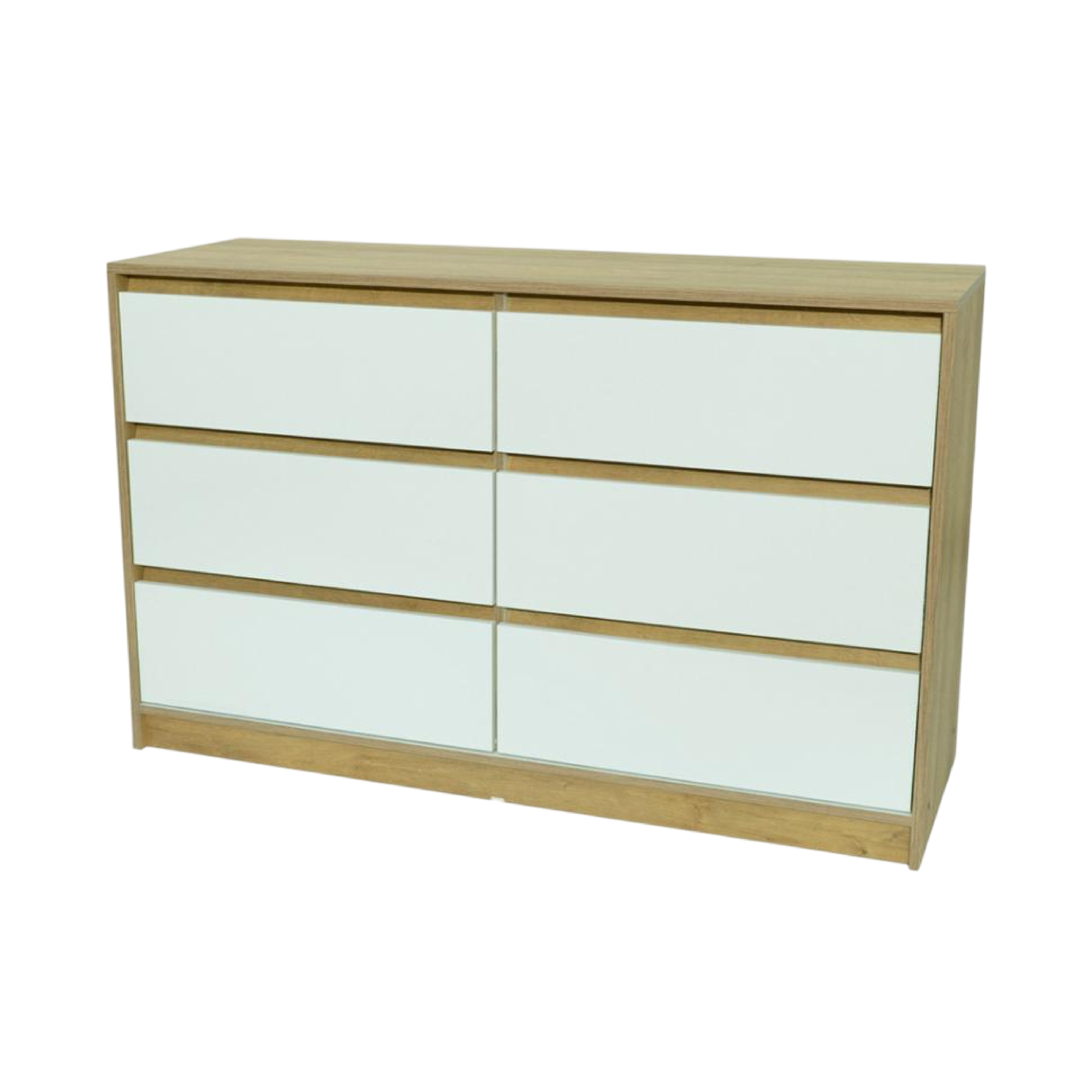 Estructura roble miel y frente de cajones blancos / 6 cajones con guias metálicas / Medidas: 0.75 de alto x 1.20 de ancho x 0.40 de profundidad.
