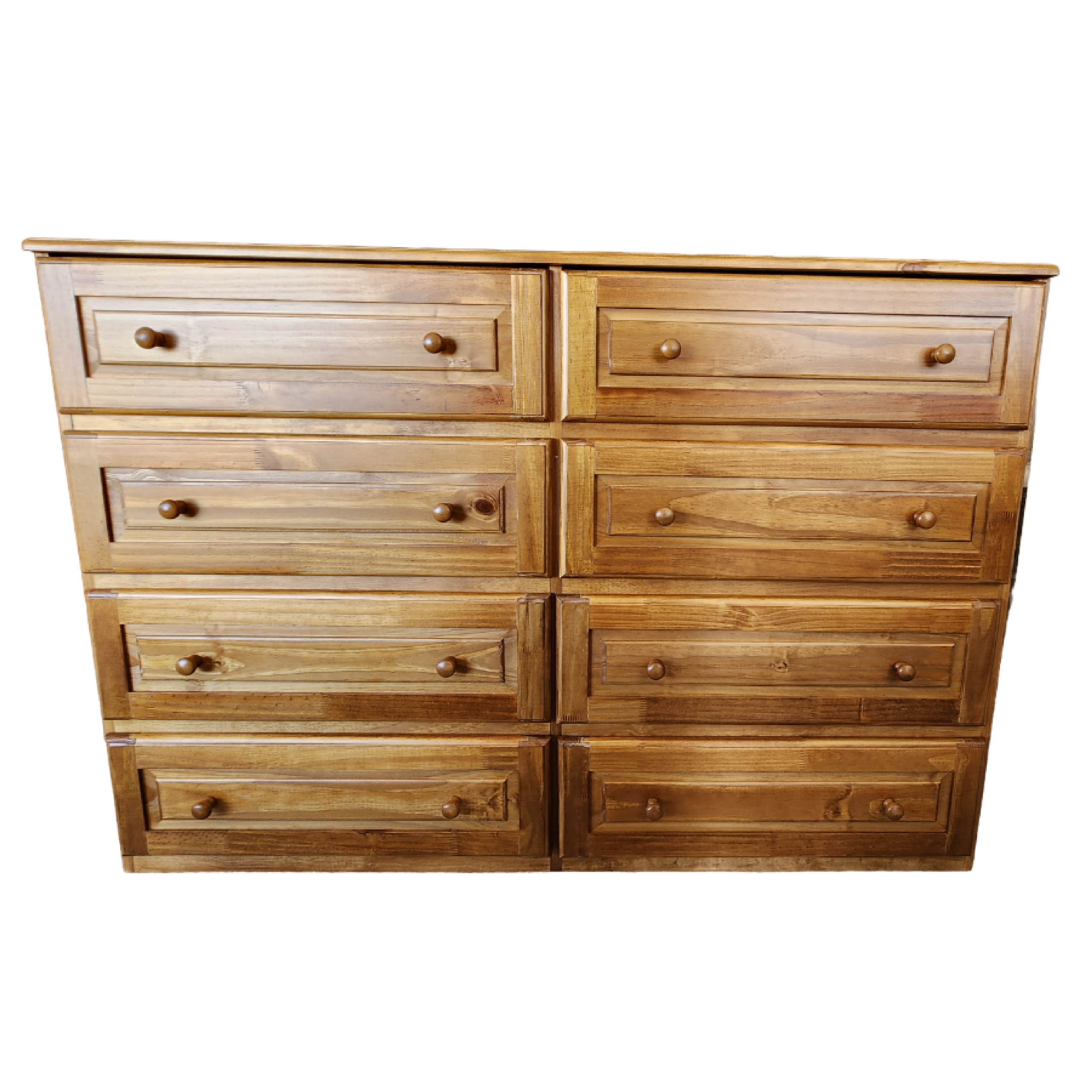 Fabricado en pino misionero / 8 cajones / Tiradores de madera / Lustre caramelo / Medidas: 1.40 de ancho x 0.50 de profundidad x 0.96 de alto.