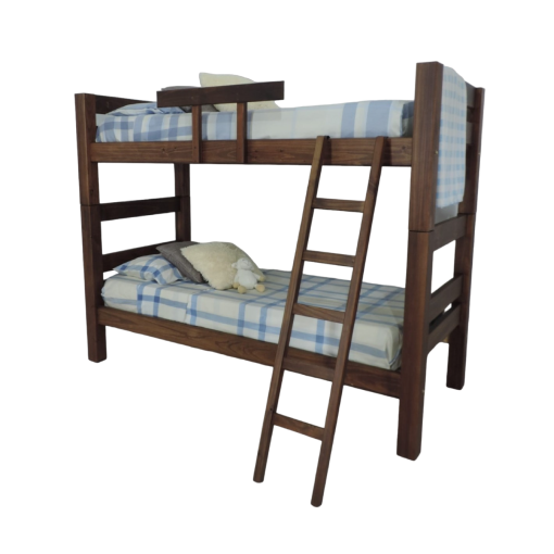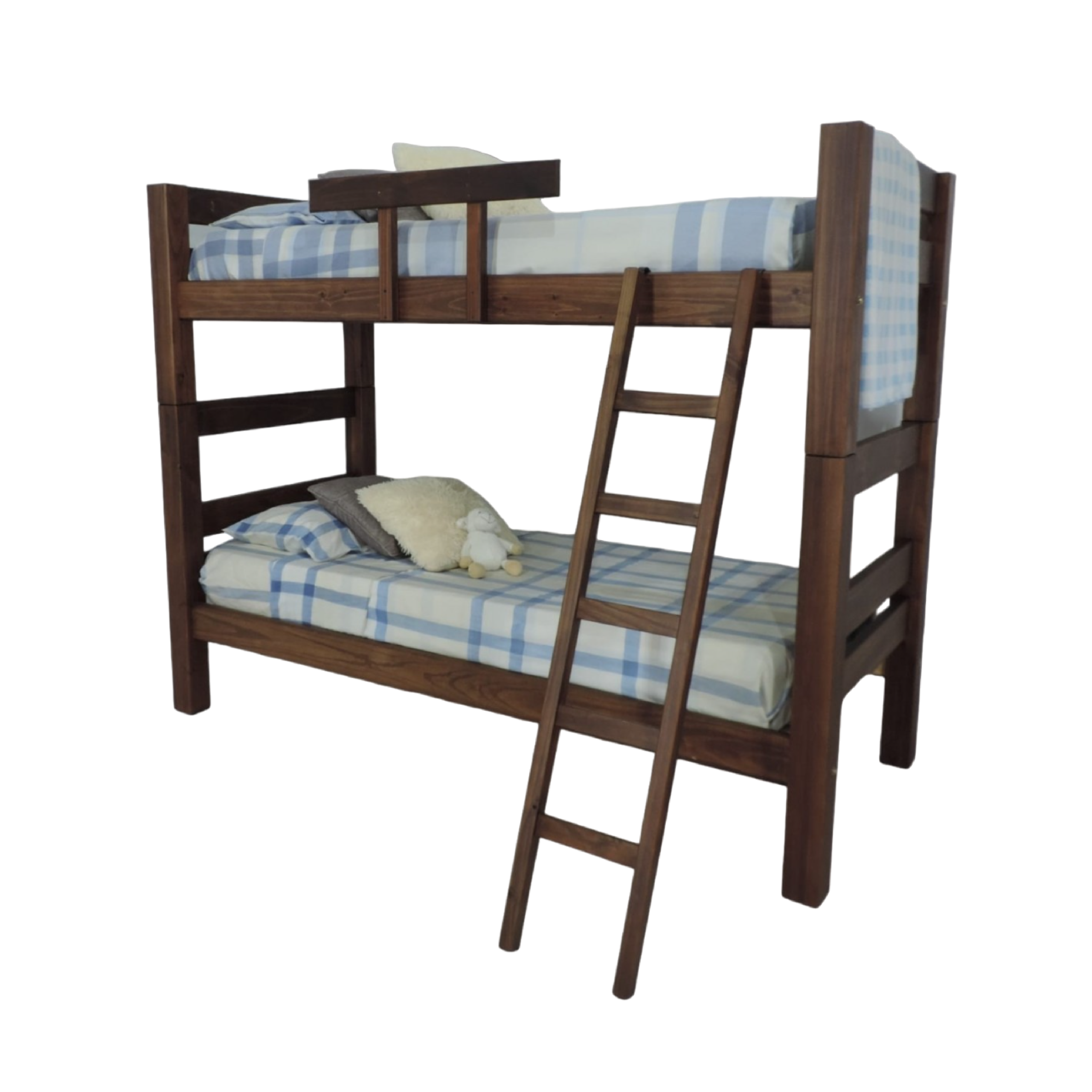 Fabricado en pino misionero / Cabecera y piecera recto / Desmontable / Patas 4 x 4pulgadas / Escalera / Lustre cedro / Medida: 0.80Mts.
