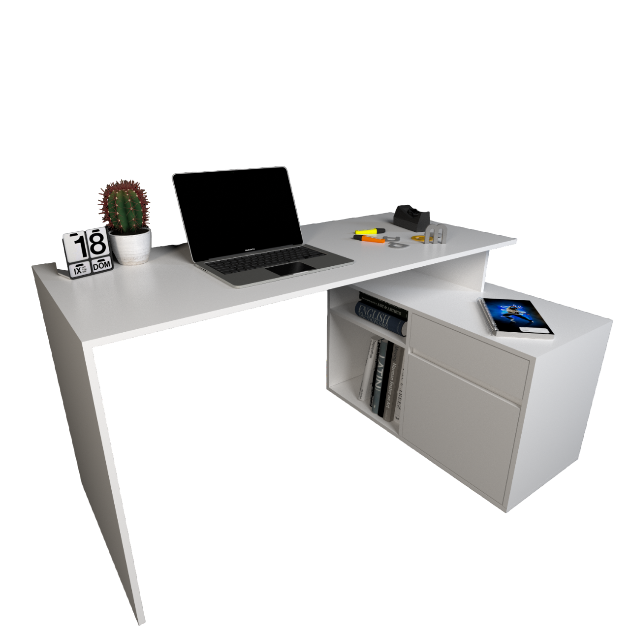 Fabricado en melamina color everest / Con mueble bajo adaptable lineal o en L izquierda-derecha / Cajón con correderas metálicas / Estante regulable / Sistema Minifix / Medidas: 1.39×0.75×0.60.