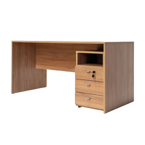 Fabricado en melamina color acacia / Cajonera móvil con 1 estante y 3 cajones (superior con cerradura) / Correderas metálicas / Medidas: 1.50 de ancho x 0.70 de profundidad x 0.74 de alto.