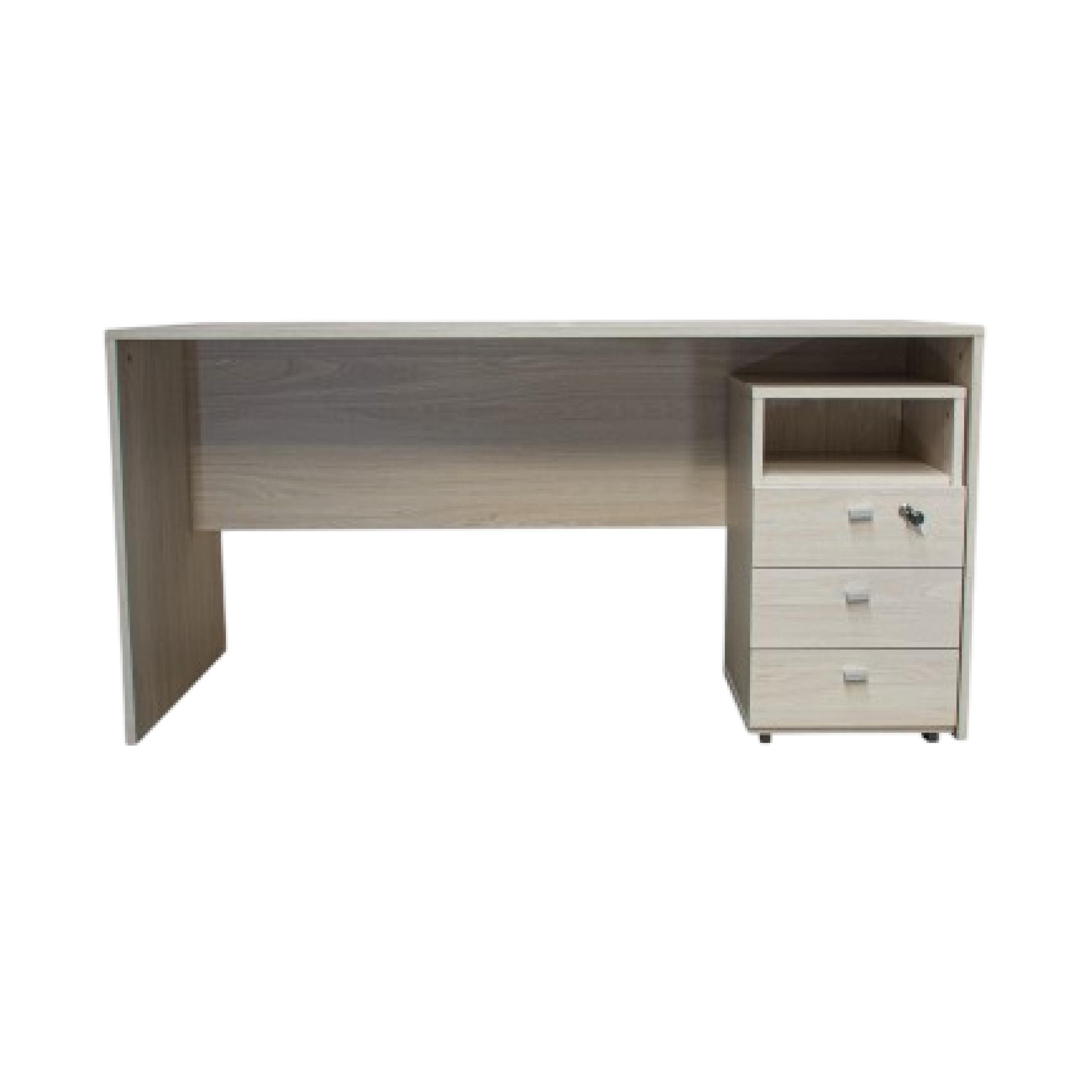 Fabricado en melamina color gris andino / Cajonera móvil con 1 estante y 3 cajones (superior con cerradura) / Correderas metálicas / Medidas: 1.50 de ancho x 0.70 de profundidad x 0.74 de alto.