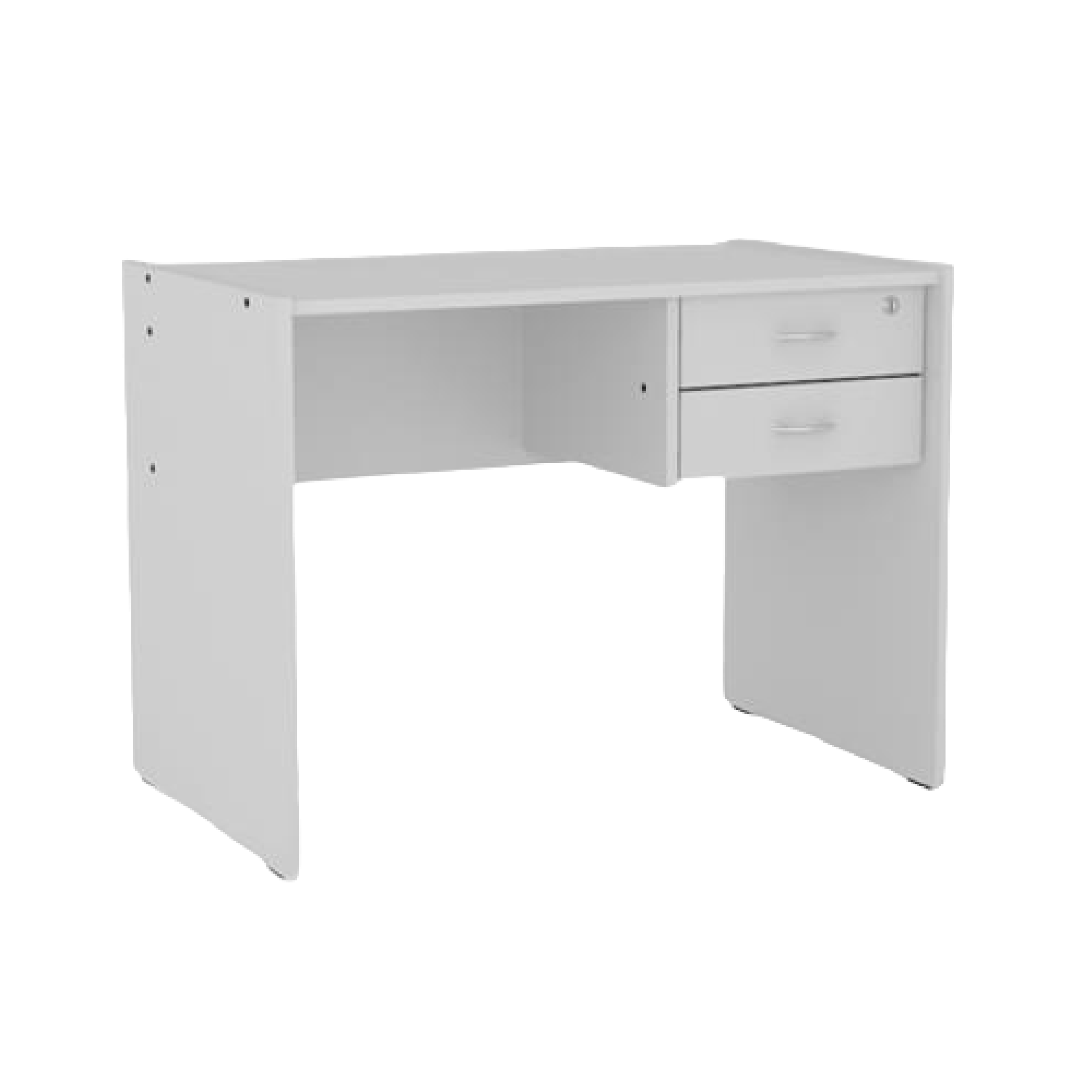 Fabricado en melamina 18mm / Cajonera doble / Cerradura en el primer cajón / Medidas: 1.00 de ancho x 0.60 de profundidad x 0.75 de alto / Color blanco.