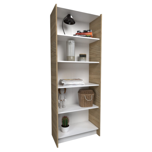 Fabricada en melamina color olmo finlandes combinado con everest / 5 estantes / Sistema Minifix / Medidas: 0.70×1.80×0.34.