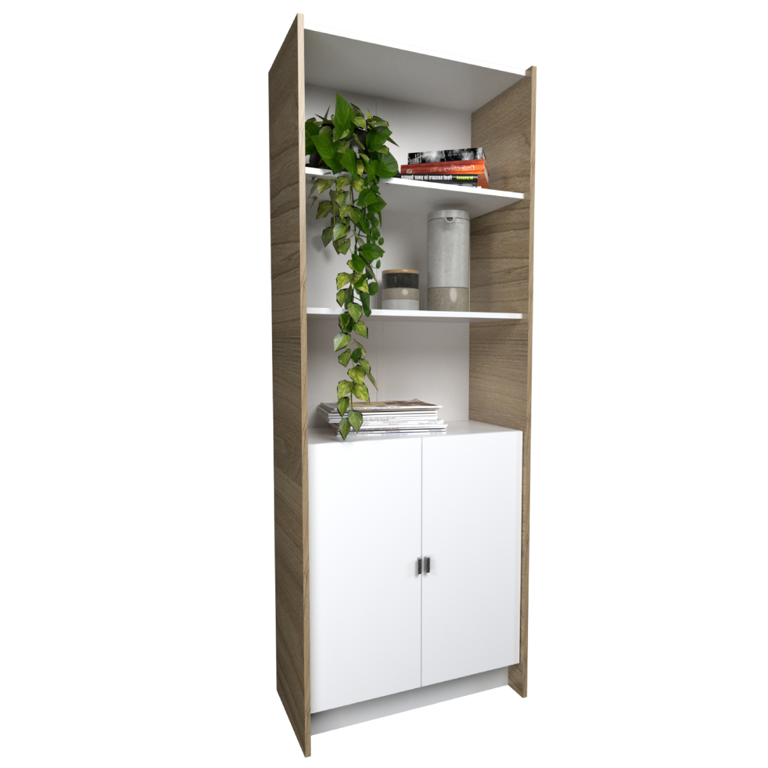 Fabricada en melamina color olmo finlandes combinado con everest / 3 estantes vistos / 2 puertas bajas con estantes / Sistema Minifix / Medidas: 0.70×1.80×0.34.