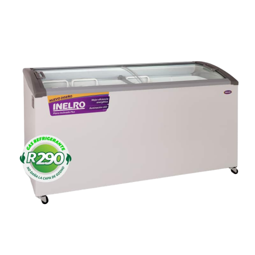 Horizontal plano inclinado / 455 litros / Gas R290 / Mejor Aislación, 20 % Ahorro Energía / 3 canastos / Tapas curvas de vidrio templado / Termostato mecánico / Condensación por aire forzado / Serpentina Caño de Aluminio / Luz led / Medidas: 0.84 de alto x 0.63 de profundidad x 1.67 de ancho.
