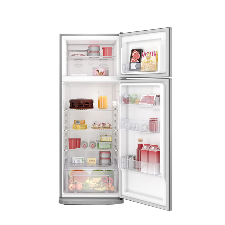 Heladera con freezer superior / Sistema de frío cíclico / Capacidad total 330 litros / Eficiencia A / Gas ecológico / Tecnología Cycle Defrost / Medidas 161,4cm de alto x 61,4cm de ancho x 62,1cm de profundidad / Color plata.