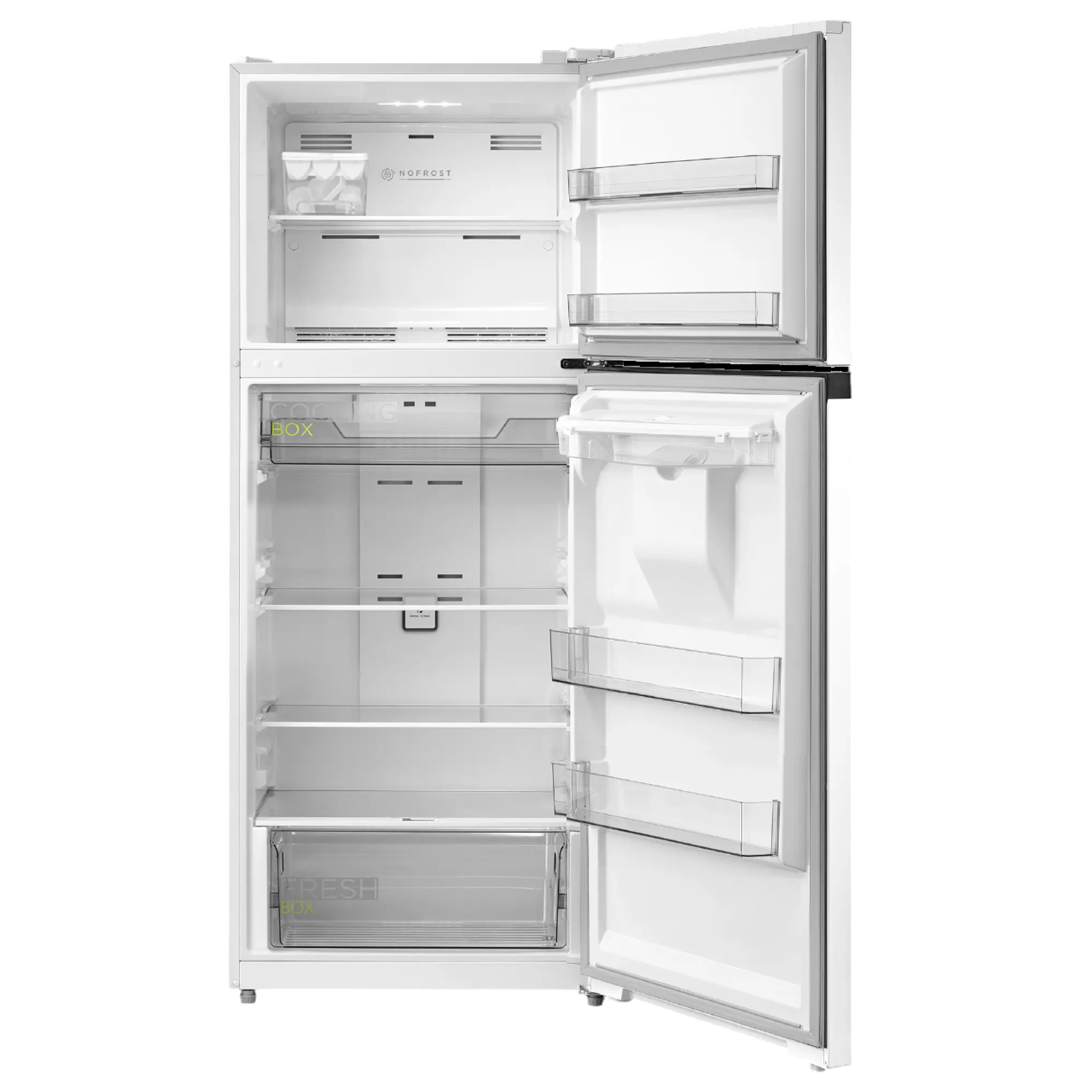 Freezer superior / Sistema No Frost / Capacidad neta 412Lts / Dispenser de agua / Gas ecológico R600a / Eficiencia energética A++ / Compresor Inverter Quattro / Sistema Multi Air Flow / Filtro Active-C Fresh contra los malos olores / Luz led / Enfriamiento rápido / Medidas: 1.73 de alto x 0.70 de ancho x 0.67 de profundidad / Color blanca.