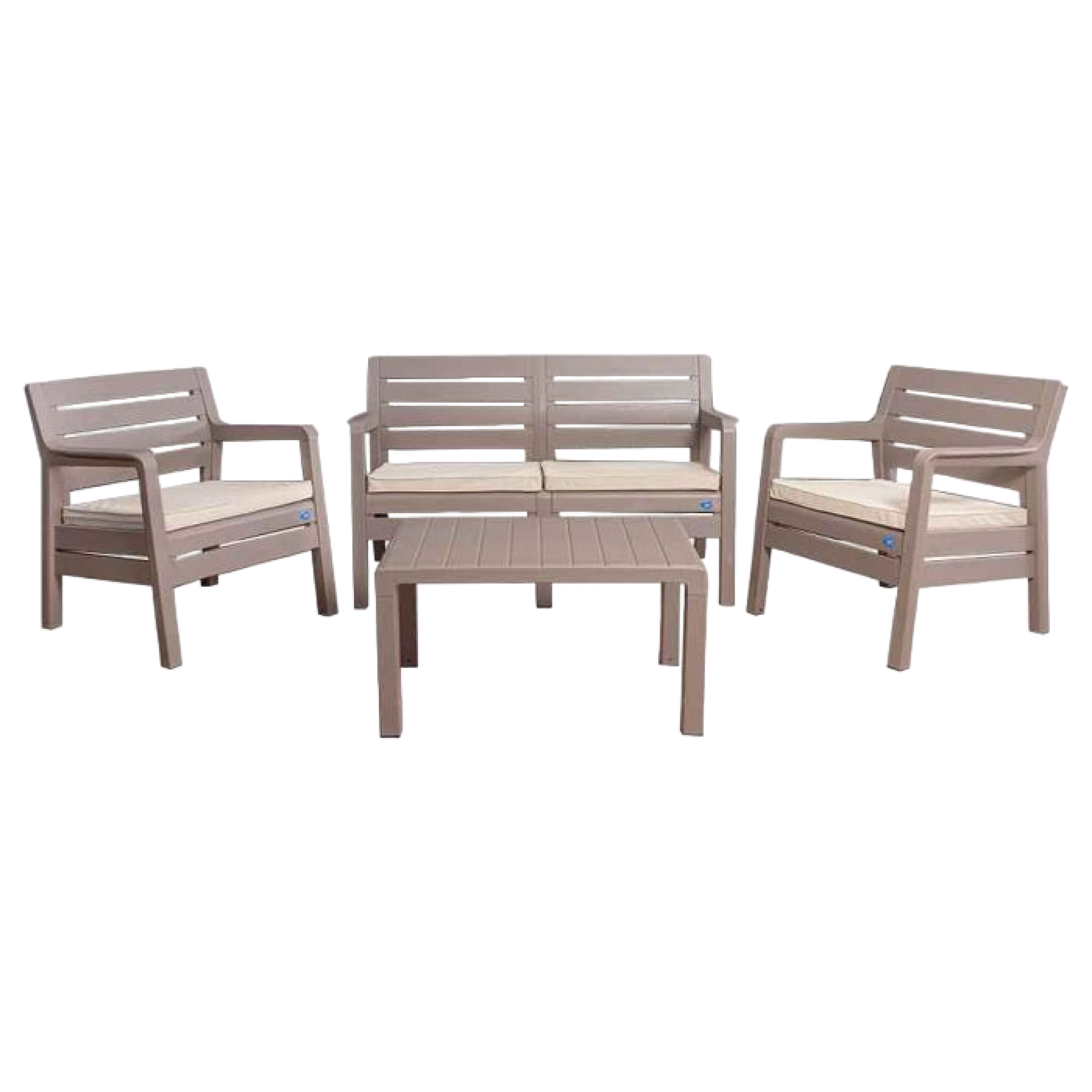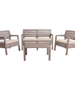 Formado por 1 sillón de 2 cuerpos, 2 sillones de 1 cuerpo y 1 mesa ratona / Fabricados en polipropileno / Tecnología Duramax / Resistencia UV / Incluye almohadones de tela impermeable / Color capuchino.