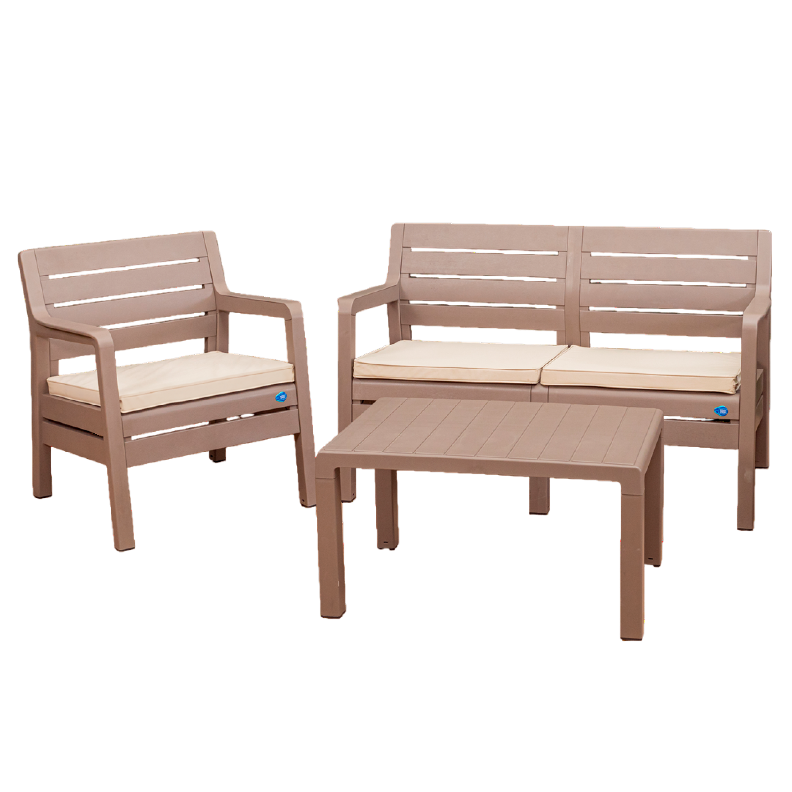 Formado por 1 sillón de 2 cuerpos, 2 sillones de 1 cuerpo y 1 mesa ratona / Fabricados en polipropileno / Tecnología Duramax / Resistencia UV / Incluye almohadones de tela impermeable / Color capuchino.