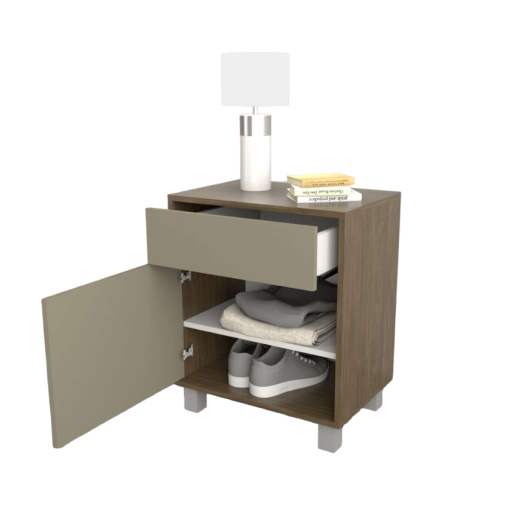 Fabricado en melamina color nogal combinado con gris cubanita / 1 cajón y 1 puerta con estante / Sistema Push / Correderas metálicas / Bisagras metálicas / Patas plásticas con terminación en laca UV / Medidas: 0.52 de largo x 0.63 de alto x 0.36 de ancho.