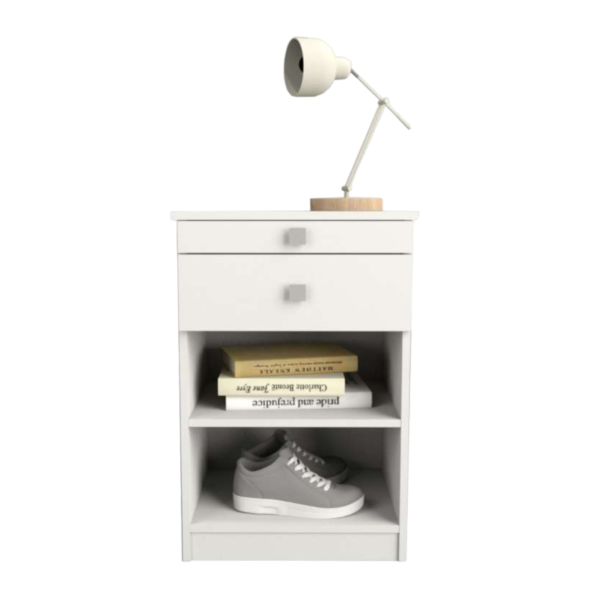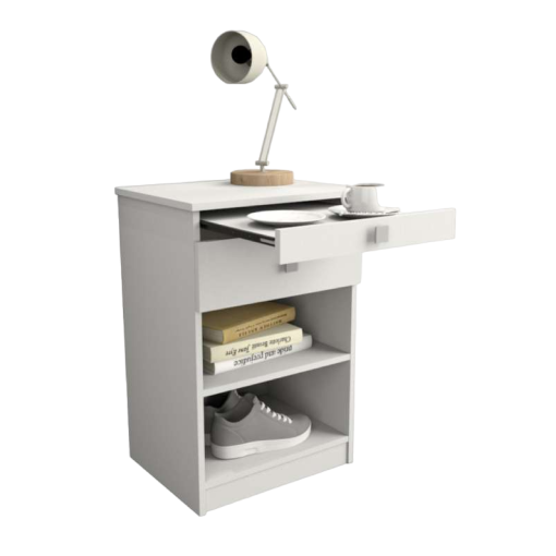 Fabricada en melaminca color blanco / 1 cajón / Bandeja desayunadora deslizable / Estante horizontal o inclinado / Tirador color aluminio anodizado / Sistema Minifix / Correderas metálicas / Medidas: 0.45×0.70×0.36.