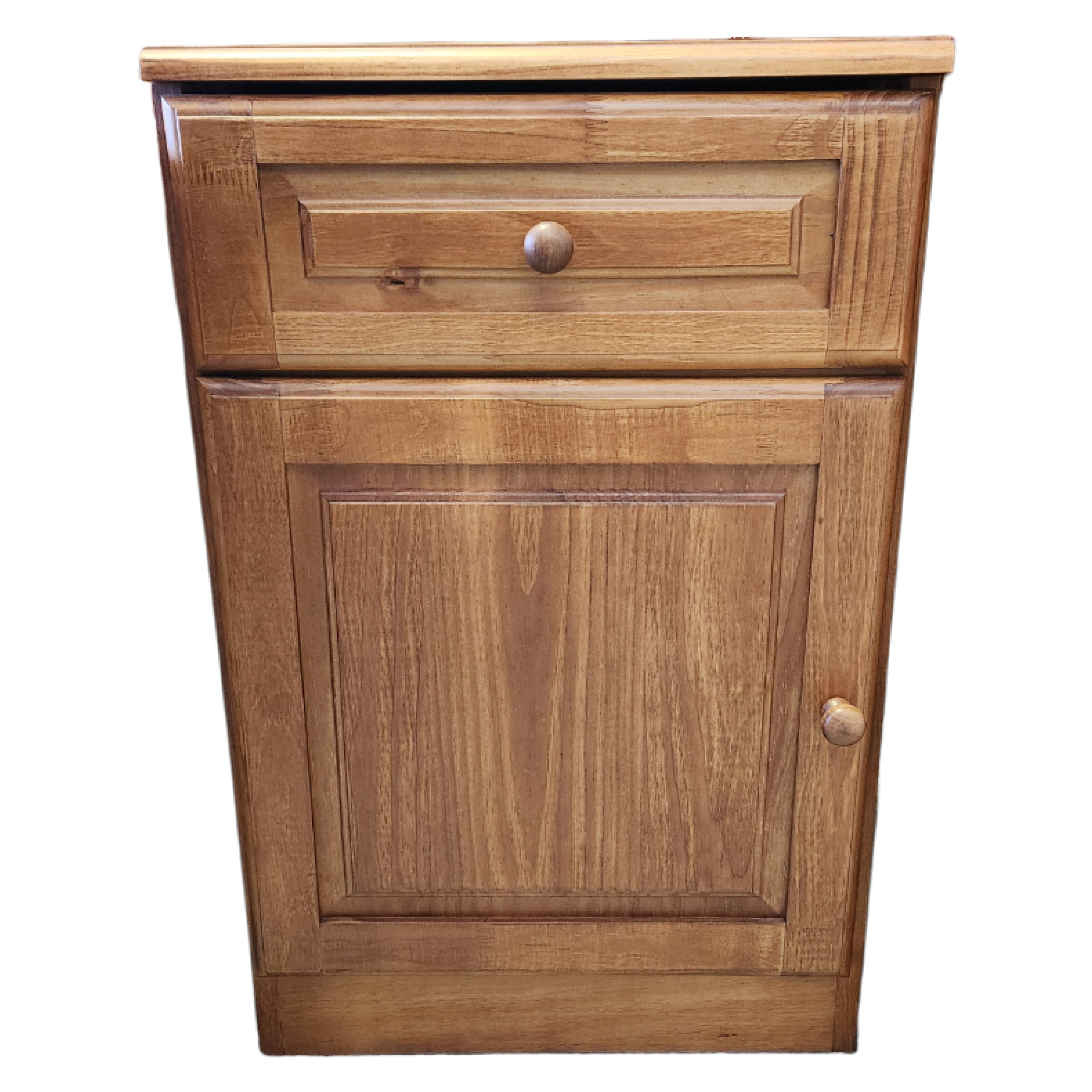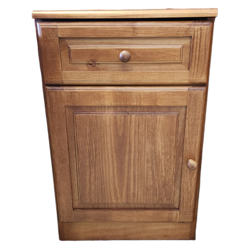 Fabricada en pino misionero / Con 1 cajón y 1 puerta / Tiradores de madera / Lustre caramelo.
