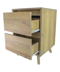 Mesa de luz con 2 cajones y patas macizas / Medidas: 40x38x60cm / Color: roble miel.
