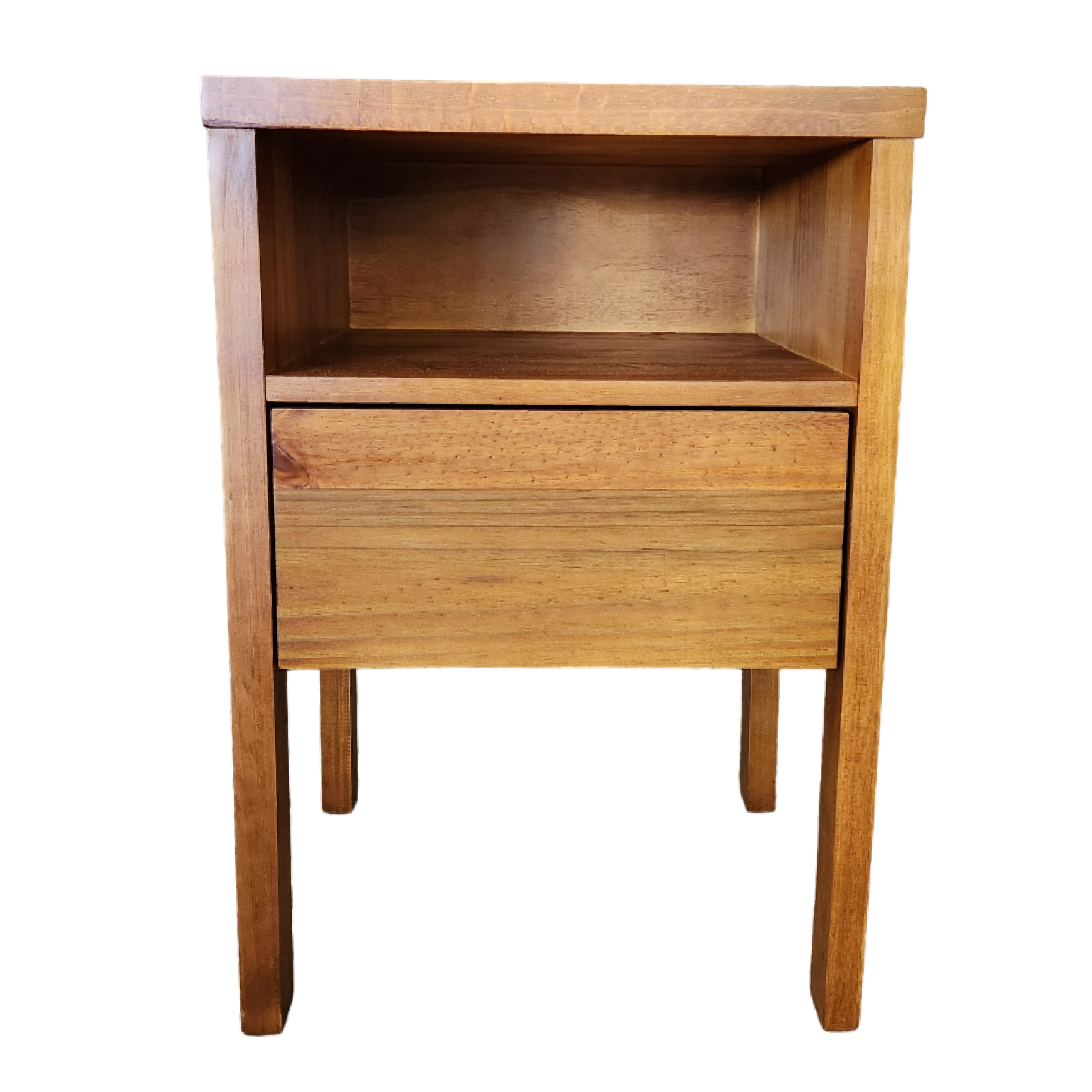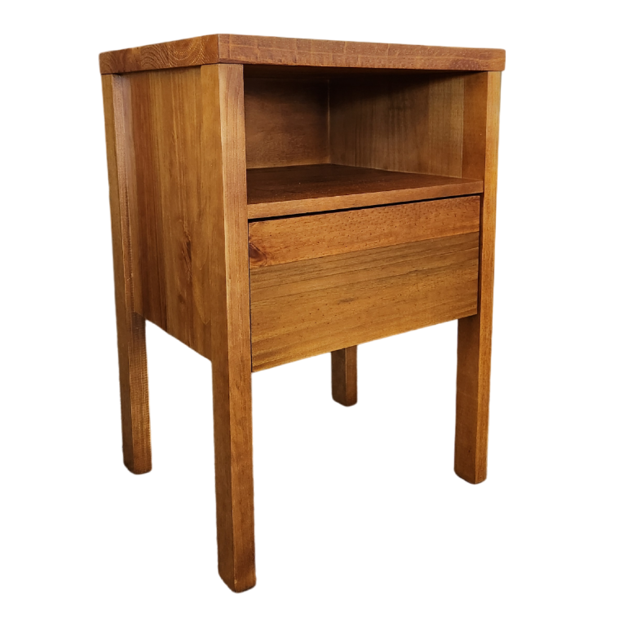 Fabricada en pino misionero / Con 1 cajón y 1 estante / Con patas / Lustre caramelo.