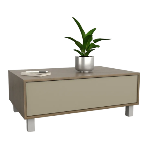 Fabricada en melamina color nogal combinado con gris cubanita / 1 Cajón con sistema Push / Sistema Minifix / Corredera metálica / Medidas: 0.91 de largo x 0.36 de alto x 0.60 de profundidad.