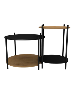 Fabricadas en melamina / Incluye 2 mesas con tamaños de 49cm y 59cm / Distintas alturas / Roble miel combinado con negro.