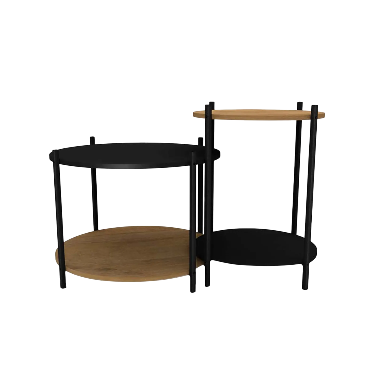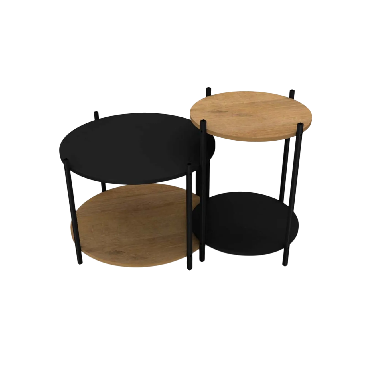 Fabricadas en melamina / Incluye 2 mesas con tamaños de 49cm y 59cm / Distintas alturas / Roble miel combinado con negro.